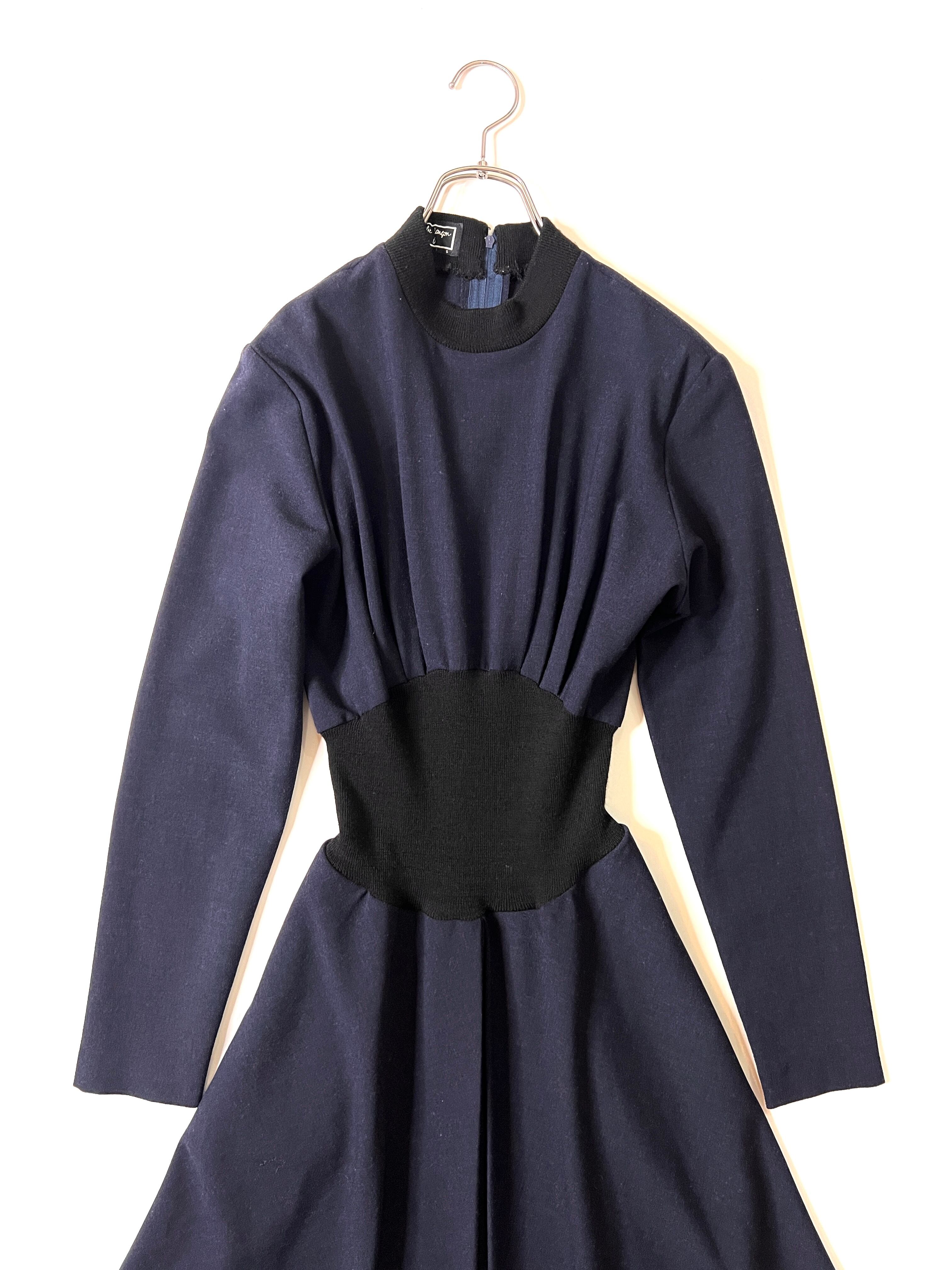 モックネックにリブ編みでシェイプされた女性らしいウエストが特徴的なクラシカルなロングドレス