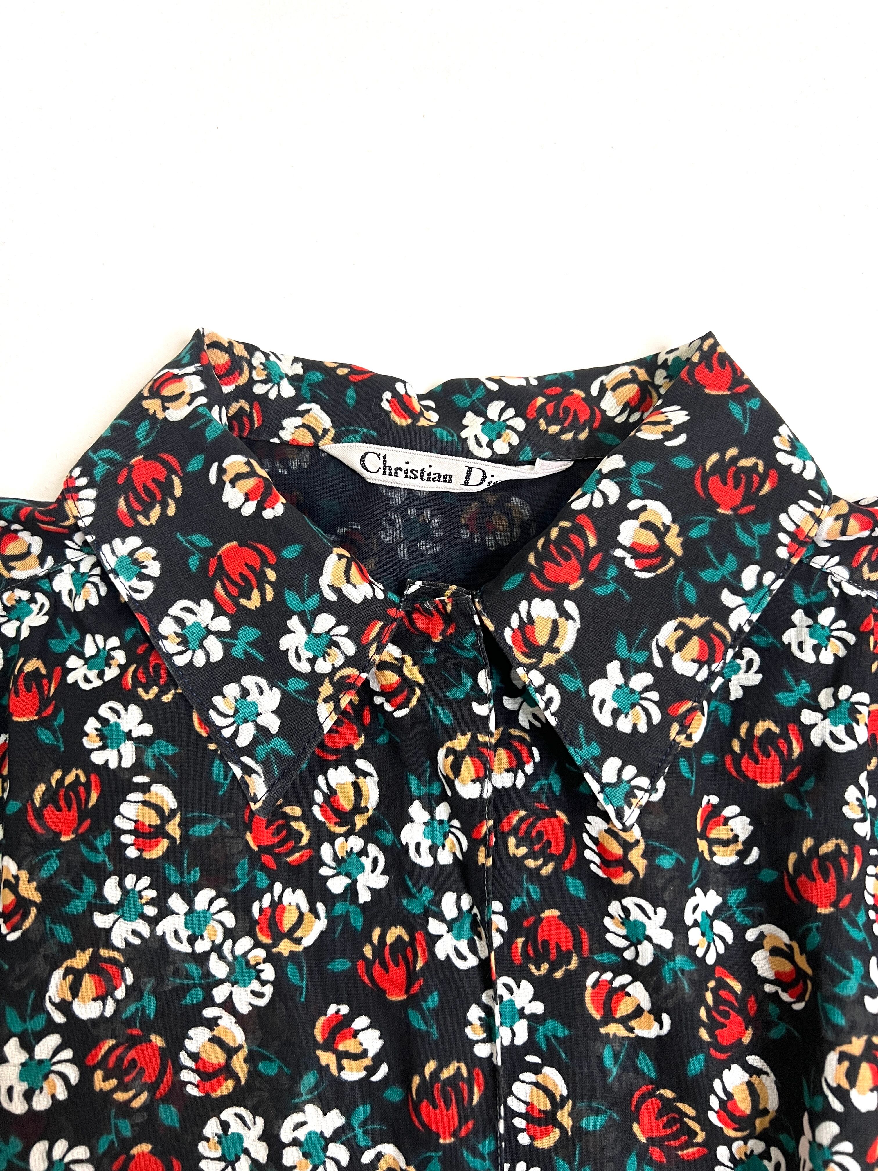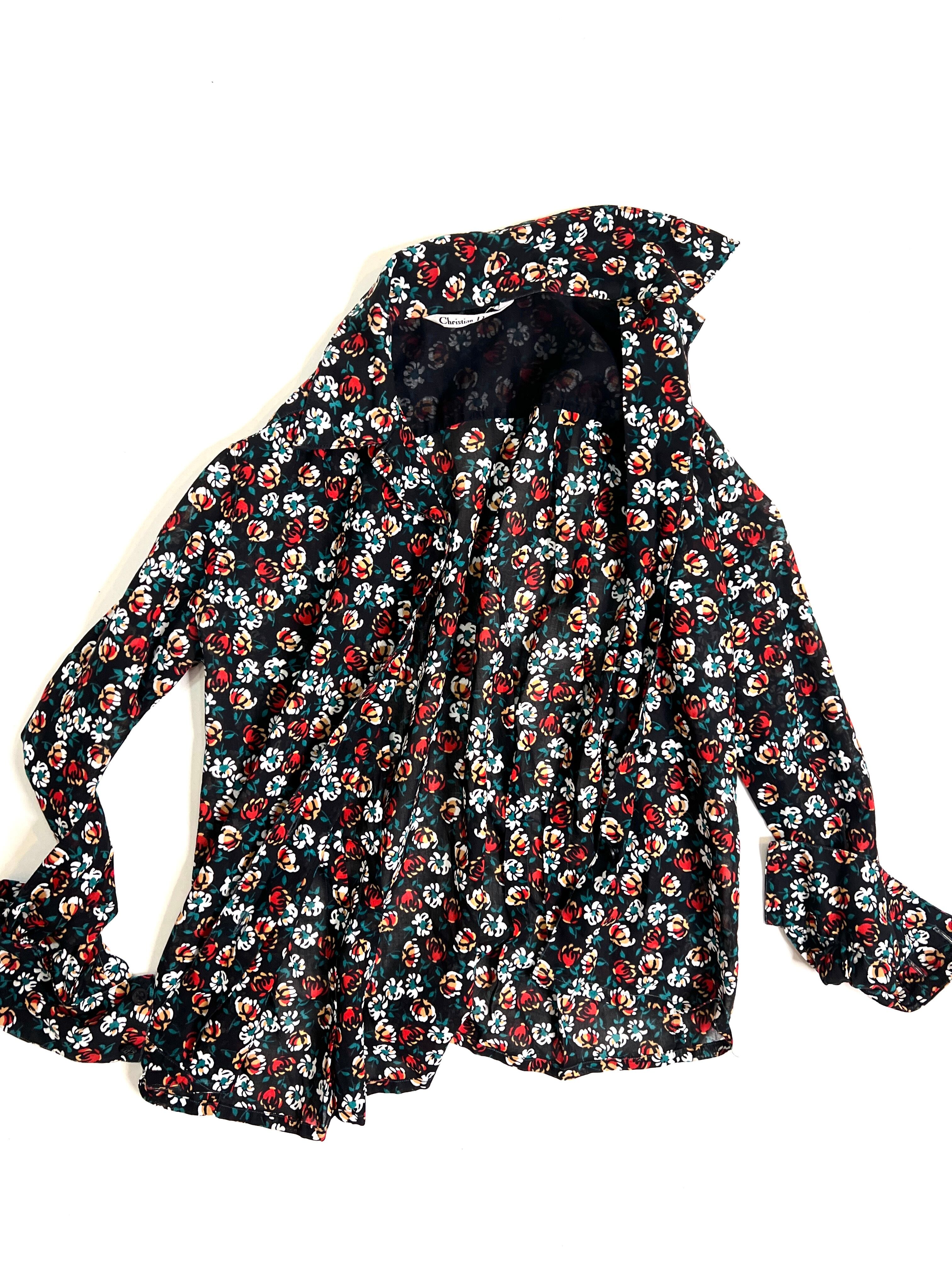 オープンカラーの襟はスナップボタンで開閉できます。バックのウエスト付近にタックを加えて若干絞られたデザインです。