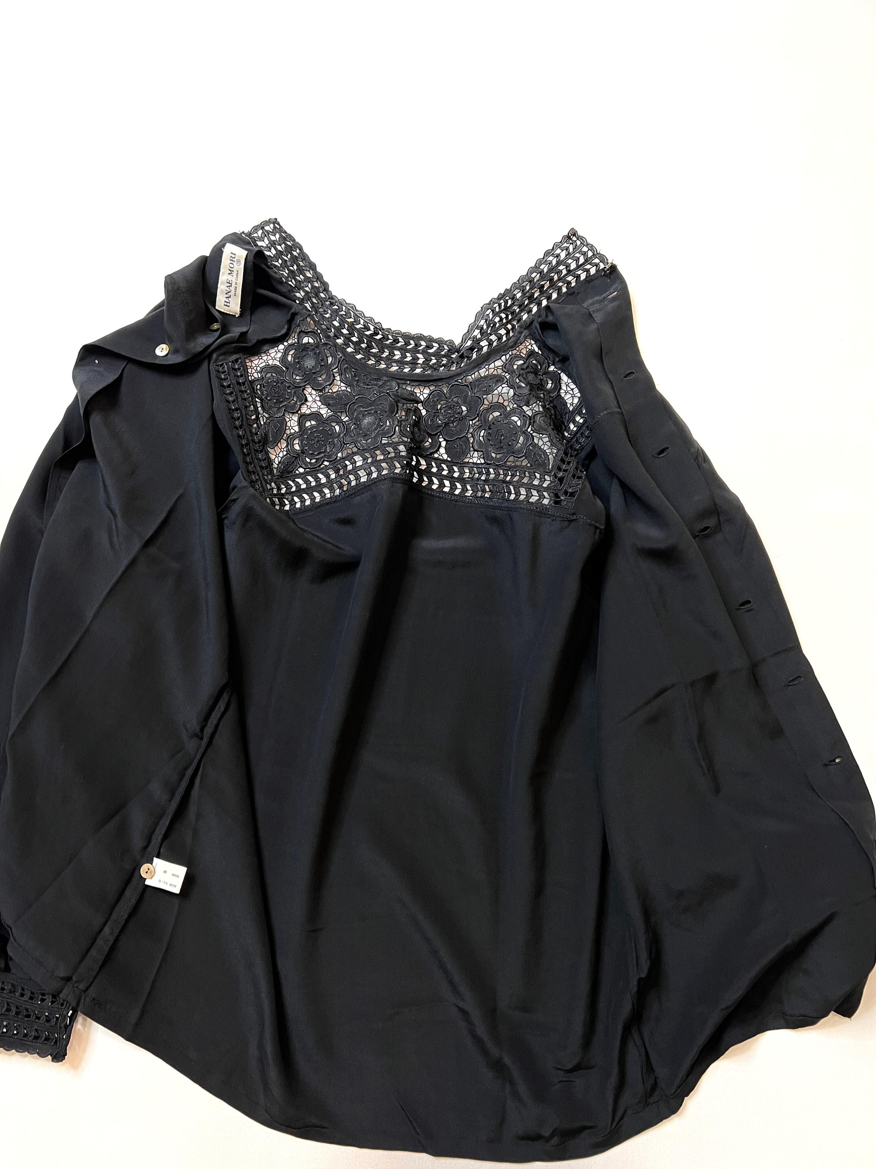 デコルテとカフスにレースをあしらったシルクブラウスです。ボリュームスリーブにバックボタンなど手の込んだノーブルな1着です。