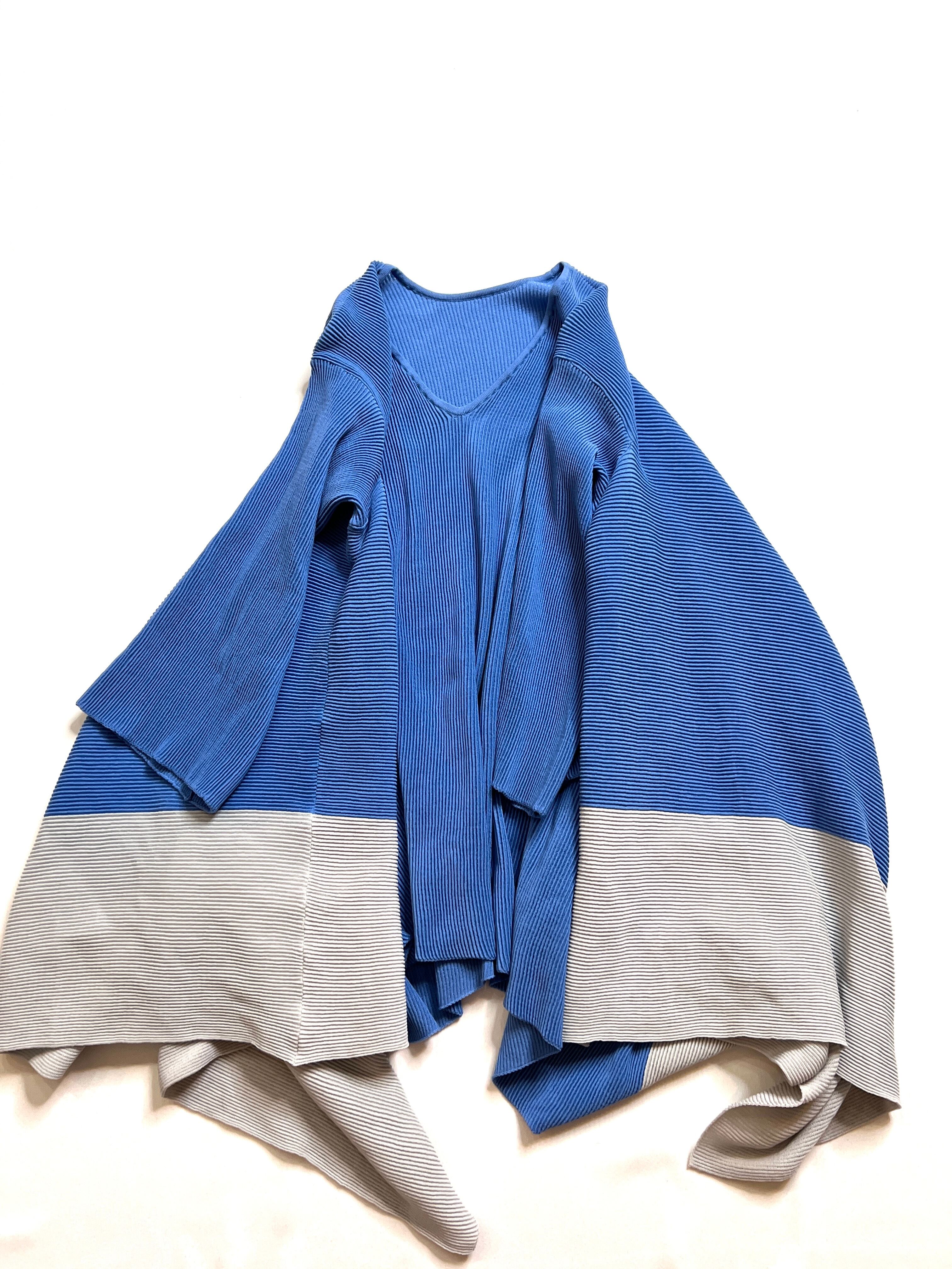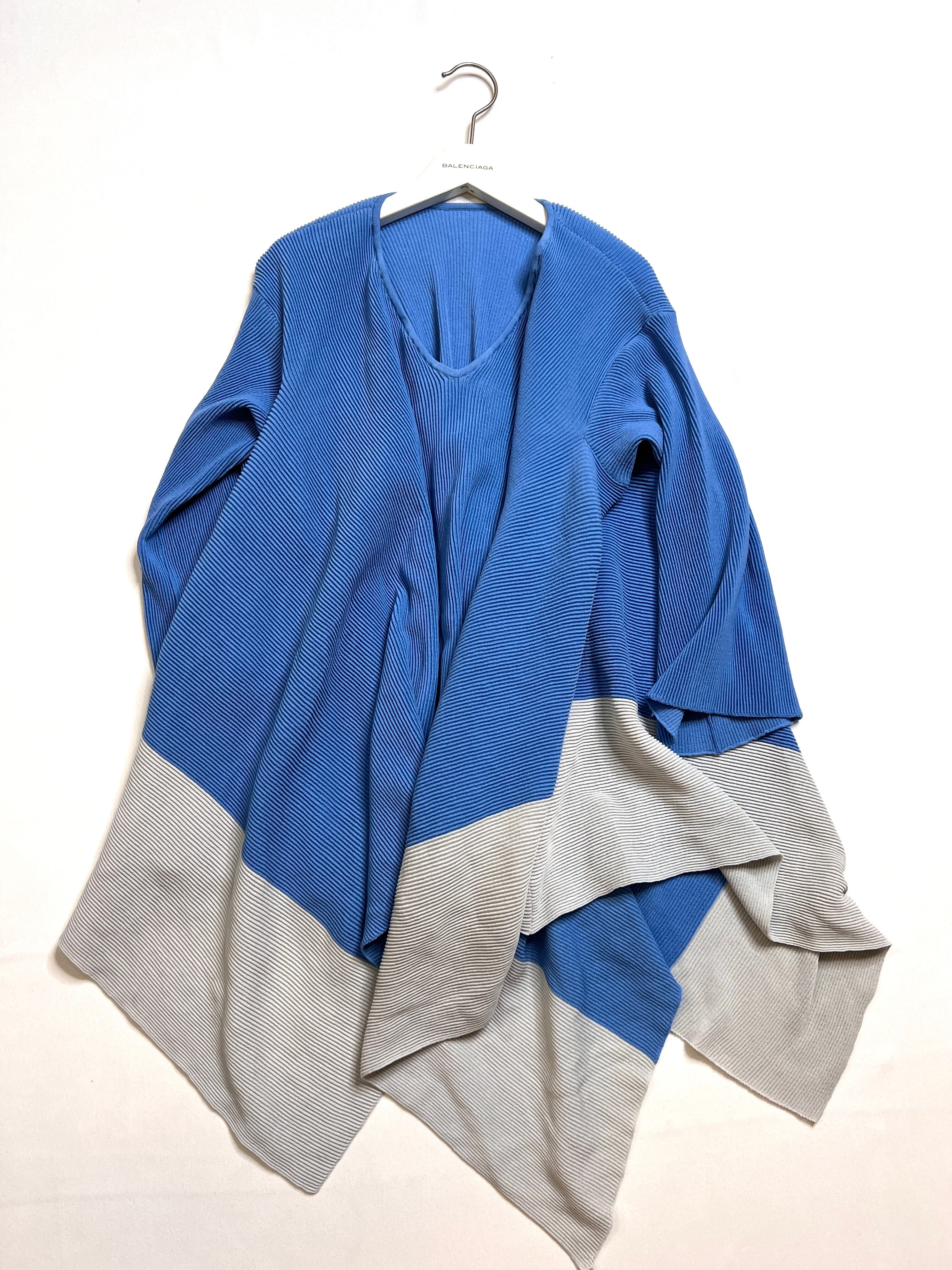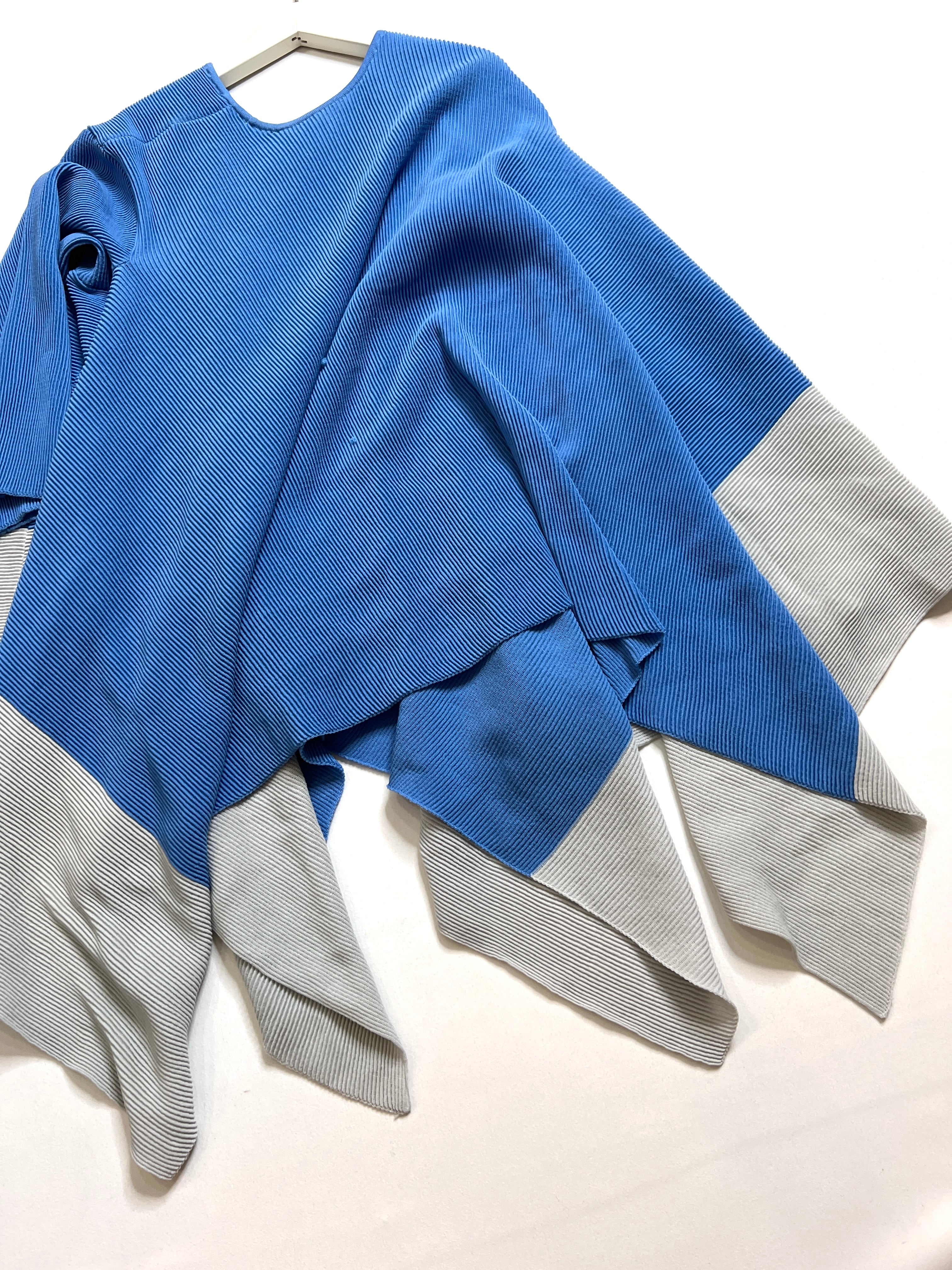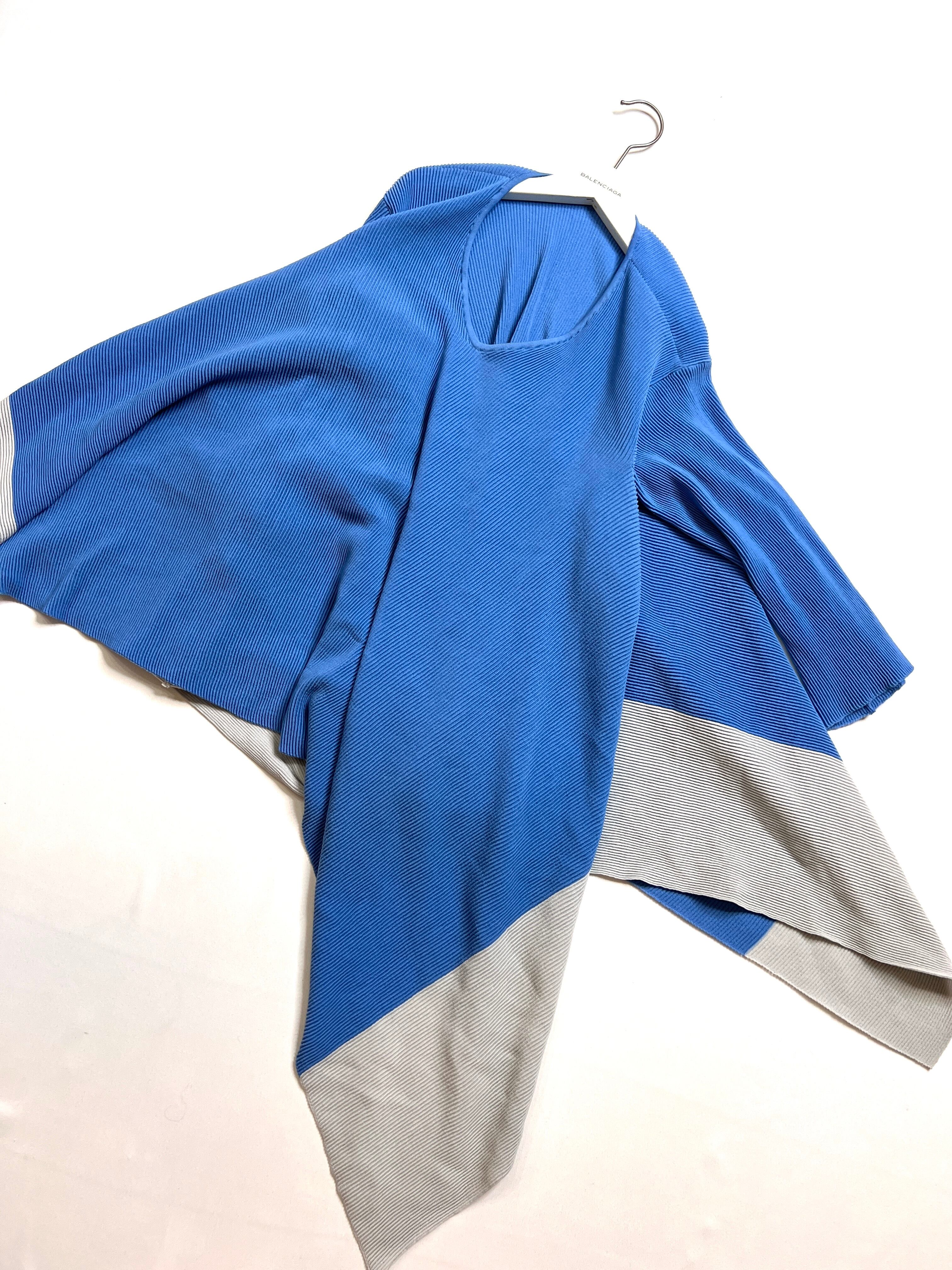 長方形の一枚布に両袖を移植したようなユニークなデザインです。身幅が広くオーバーサイズで着用した時のたっぷり感やドレープが素敵です。