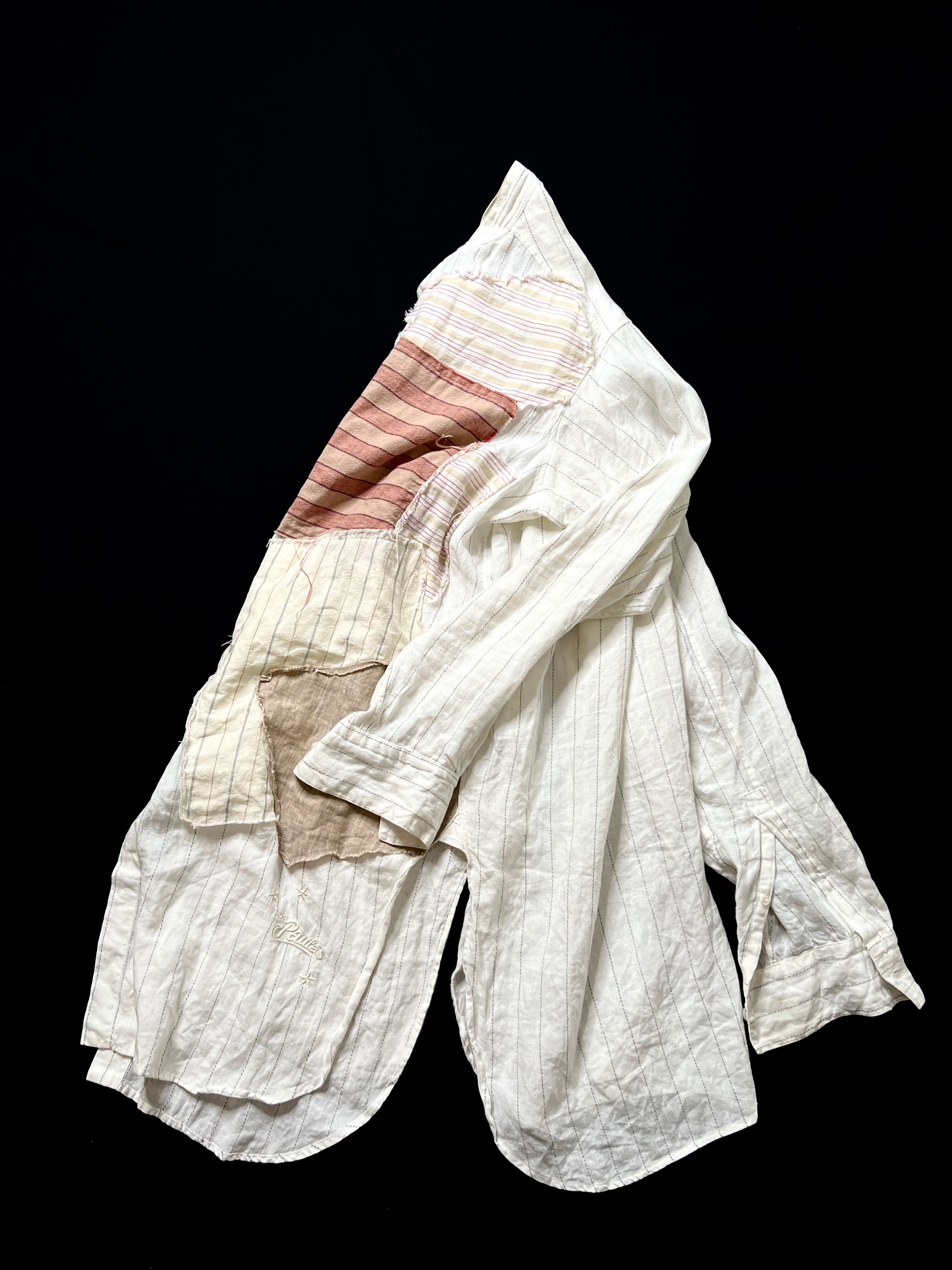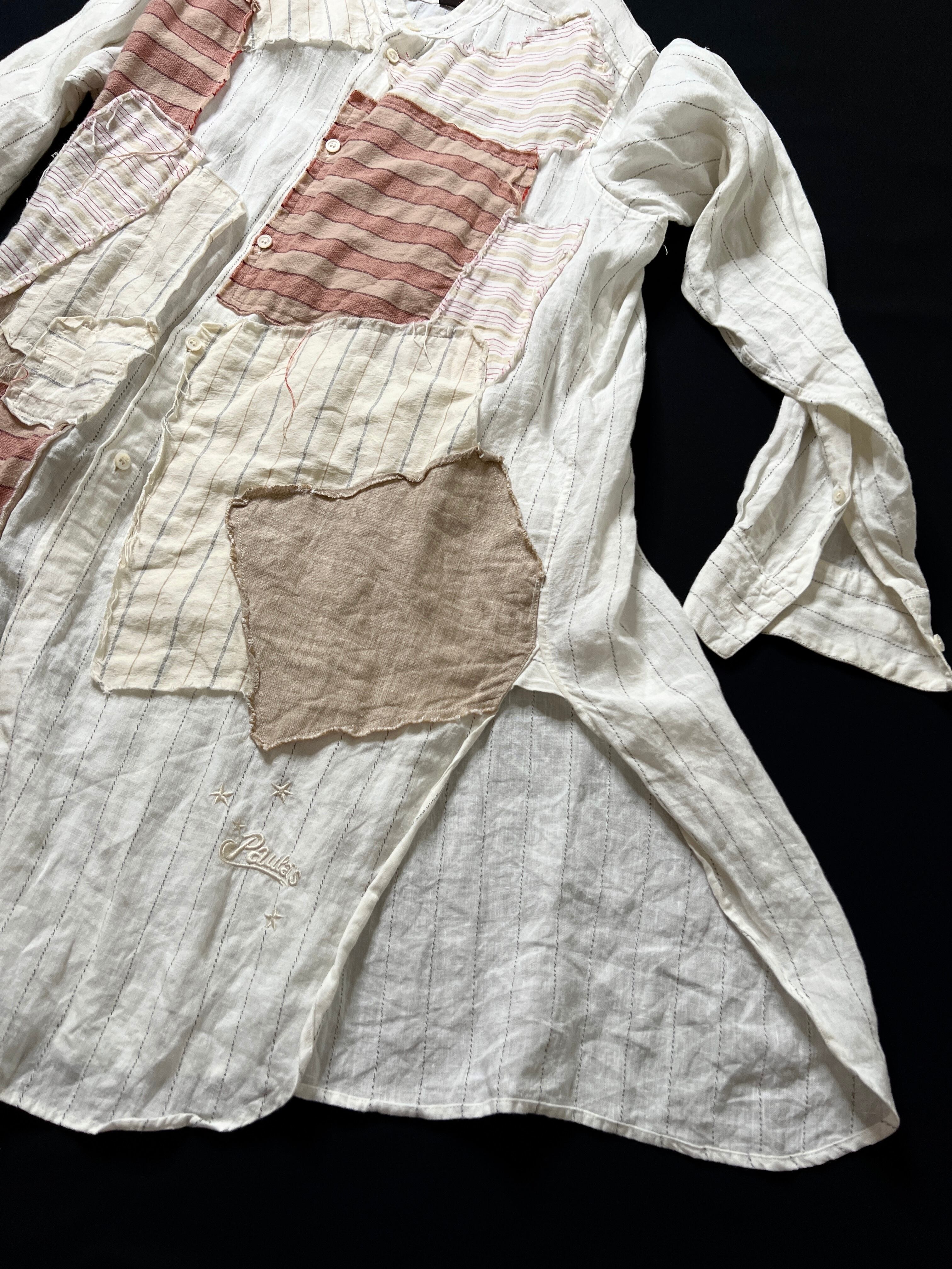 上質なリネンを使用したパッチワークのロングシャツです。軽量なだけでなく肌触りが良く、メンズですが男女間でも気軽に共有していただけます。