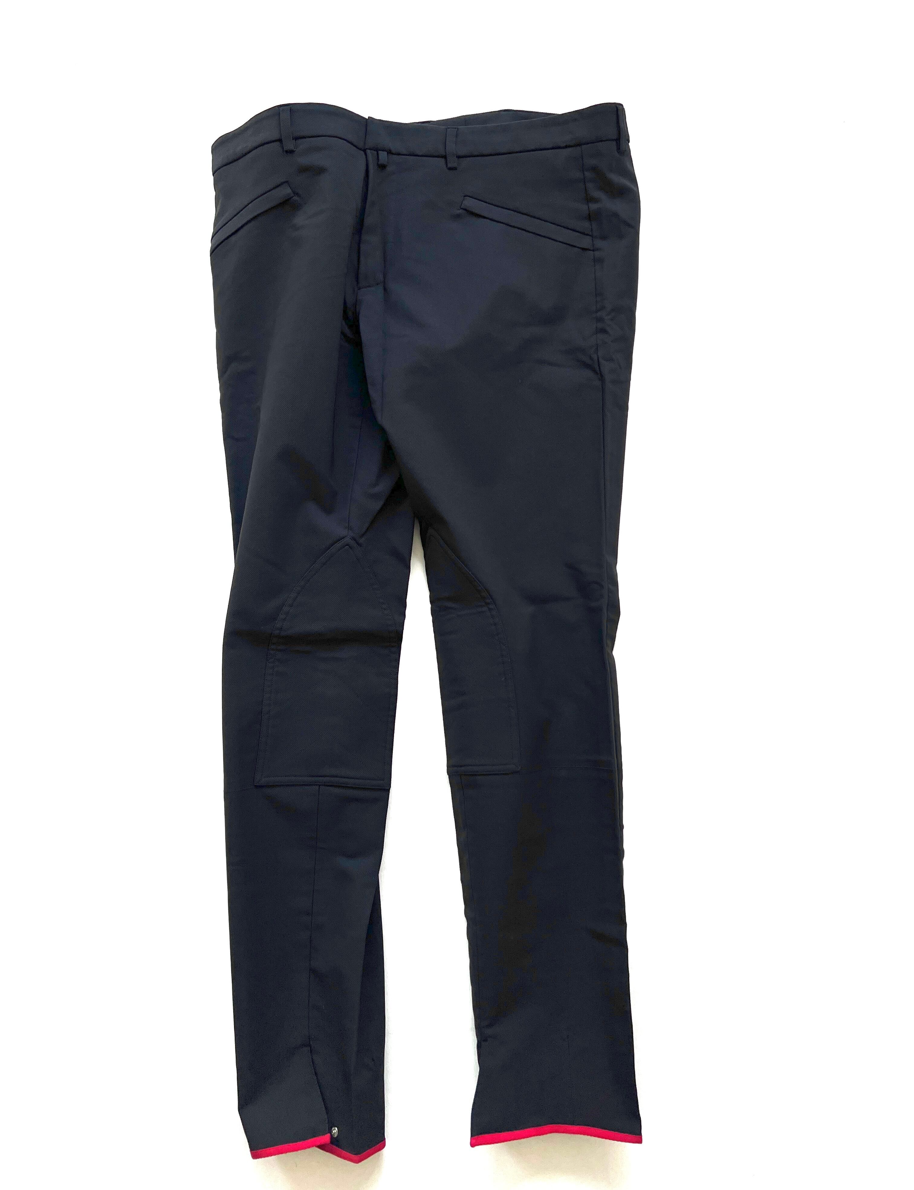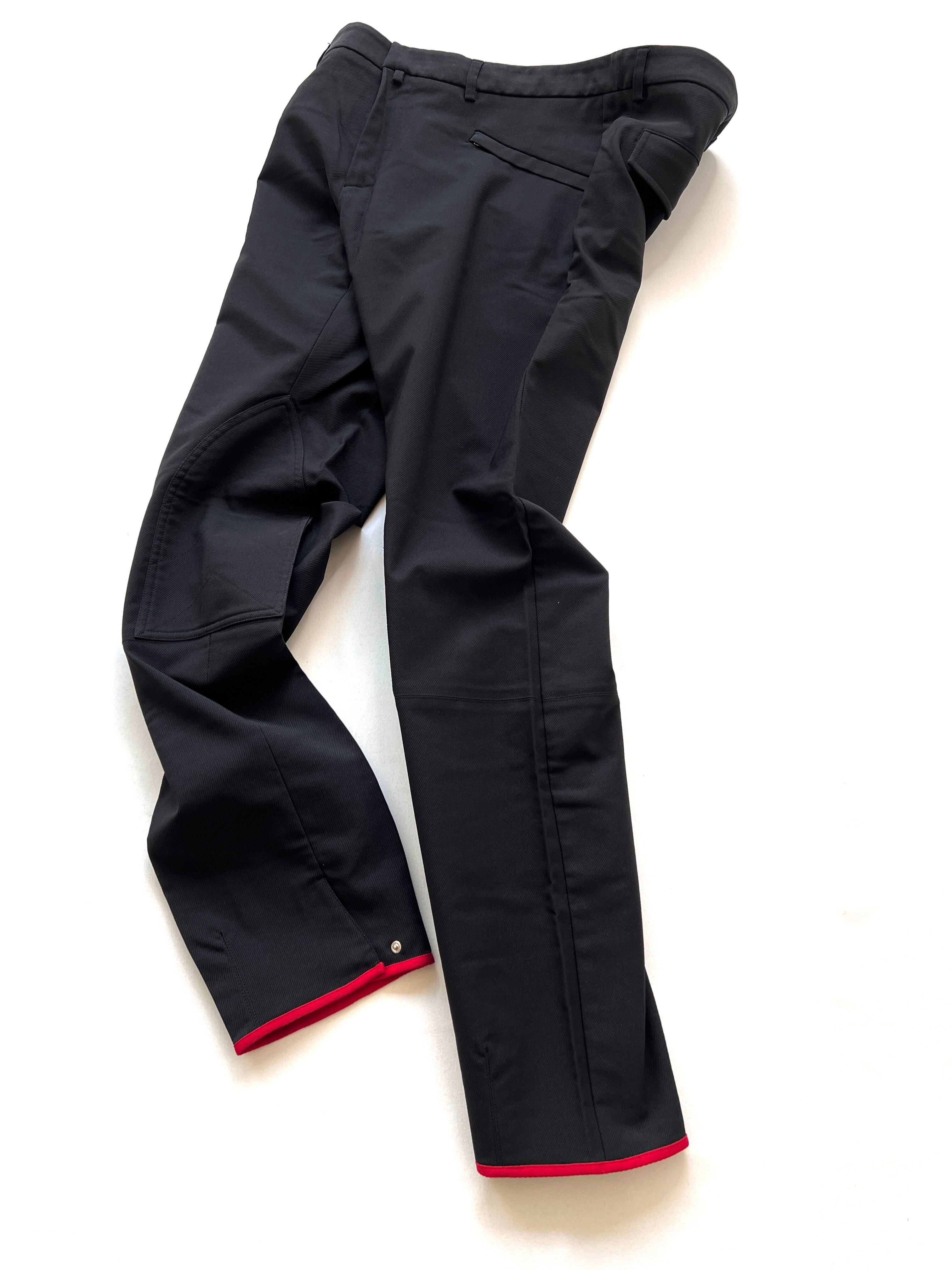 膝パッチやスナップボタン式の裾スリットや赤のパイピングなど細かなギミックを盛り込んだ乗馬パンツです。