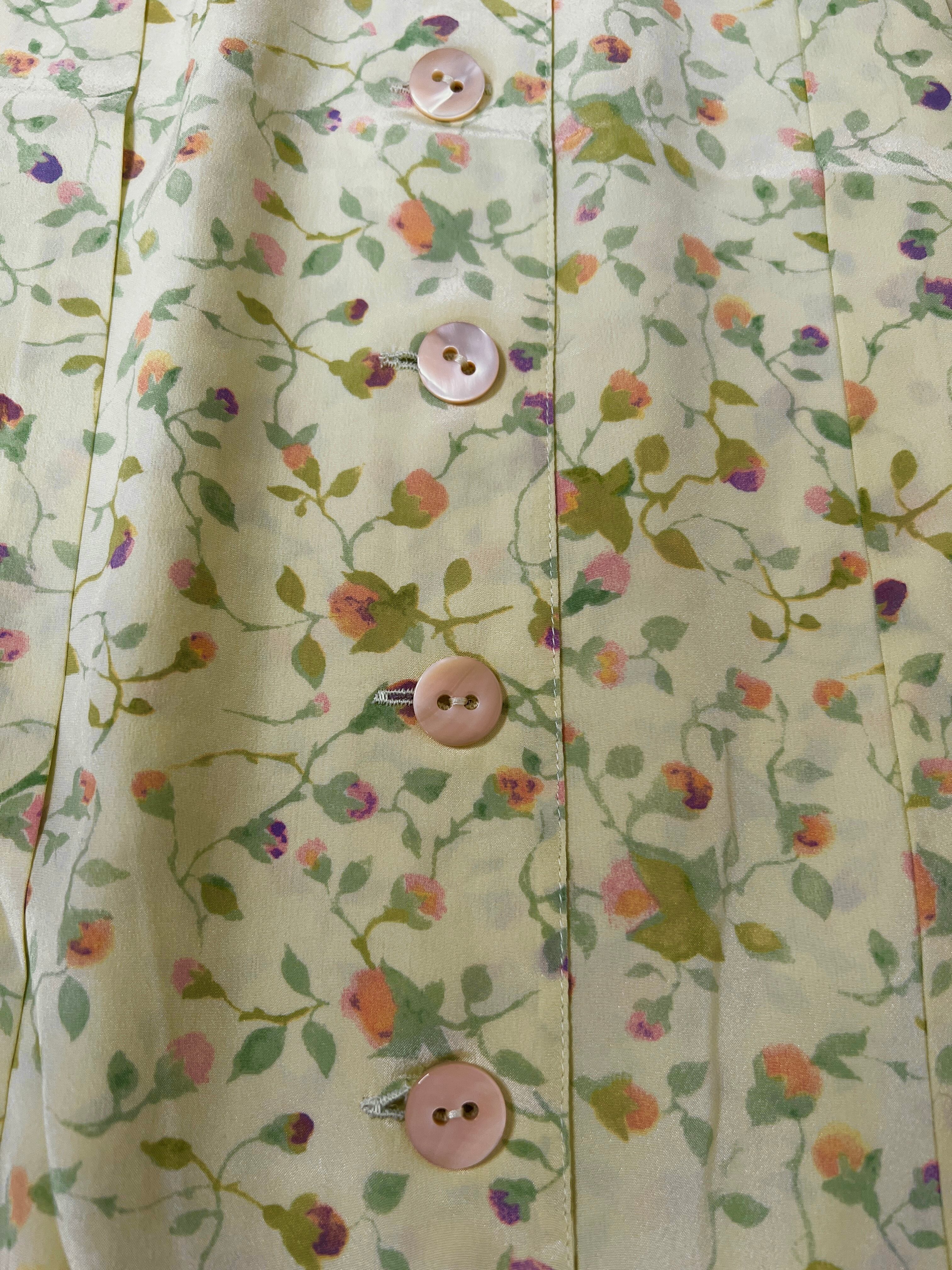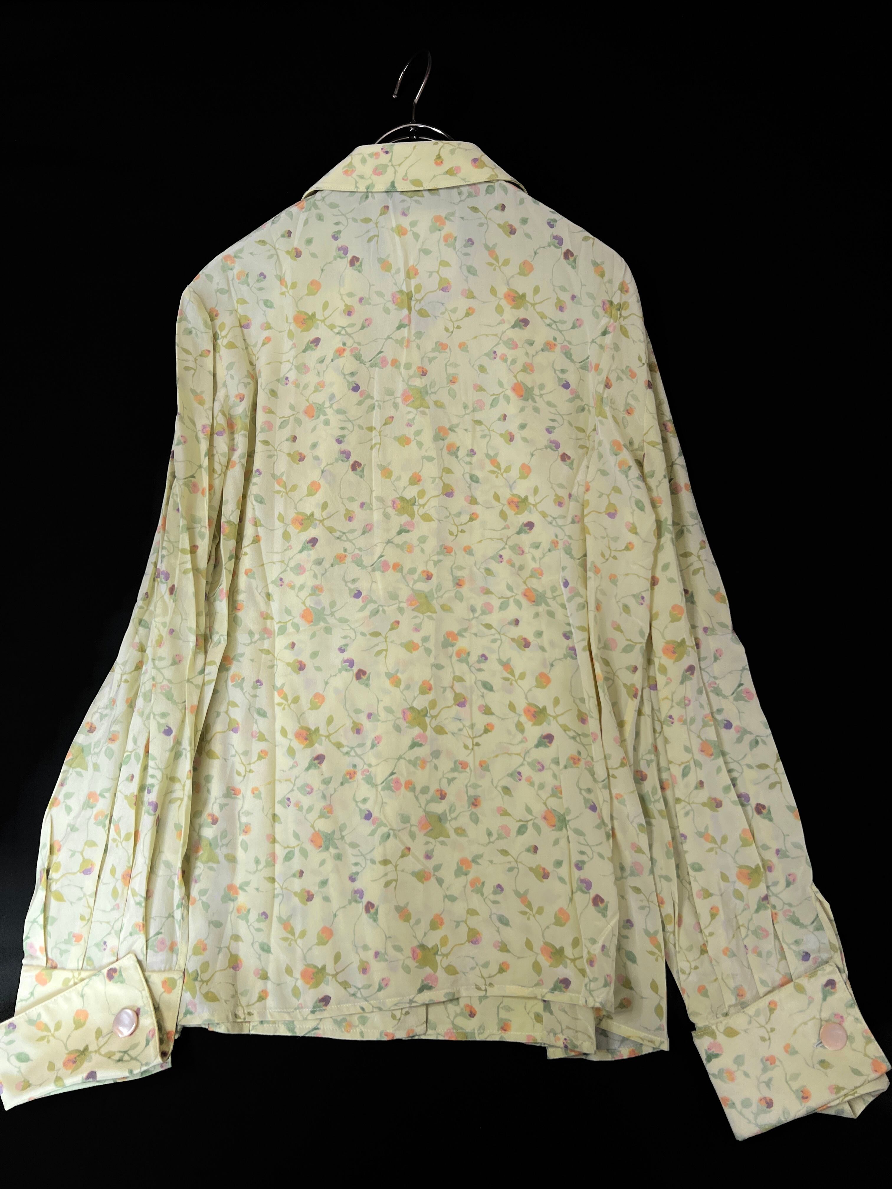 明るいフローラルプリントが特徴的なシルクシャツ、上品さと優雅さを兼ね備えています。