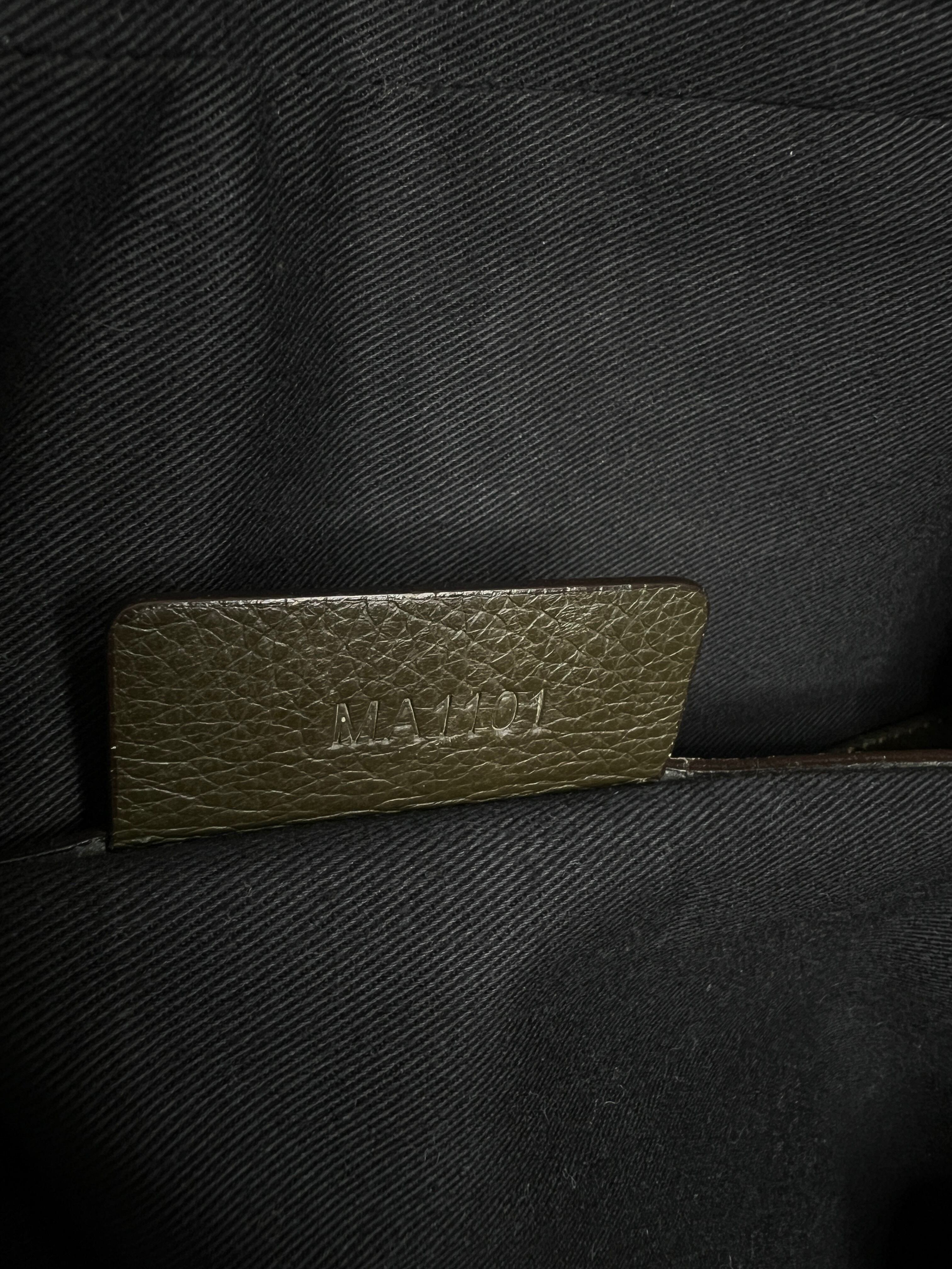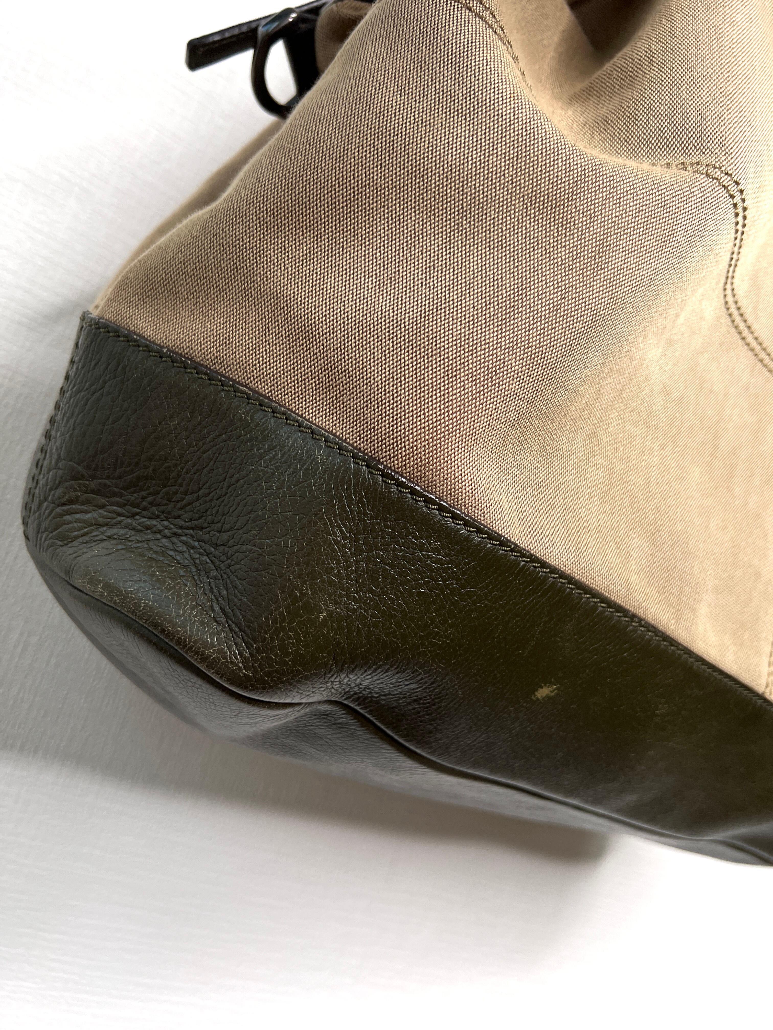 オリーブグリーンのレザーとカーキベージュのコットンキャンバスで作られた渋めのカラー、少々使用感やレザーにスレなどはありますがヴィンテージ調の風合いがとても良い雰囲気です。