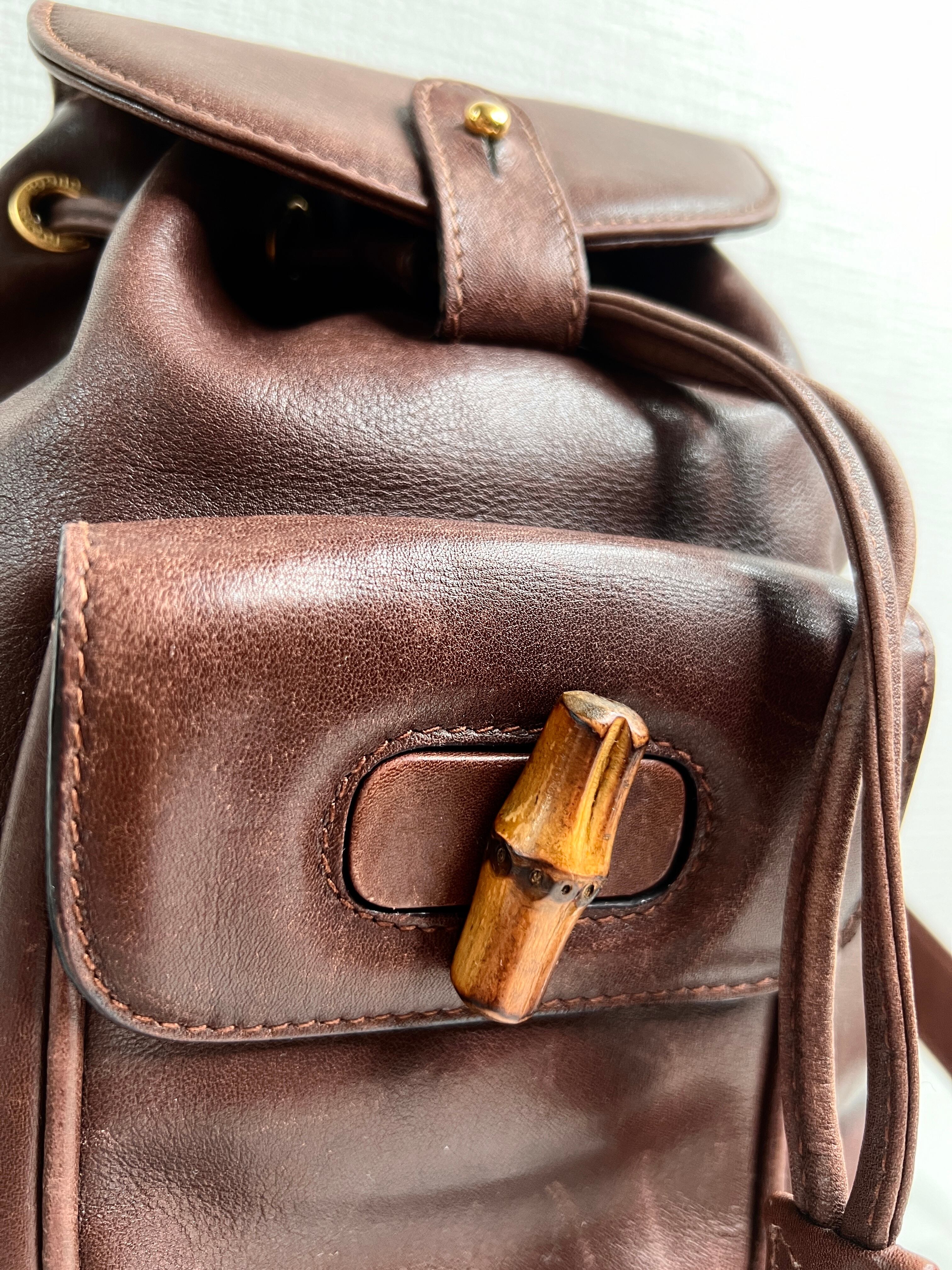 ブラウンレザーのバンブーリュック、コンパクトでちょっとした外出に便利です。
