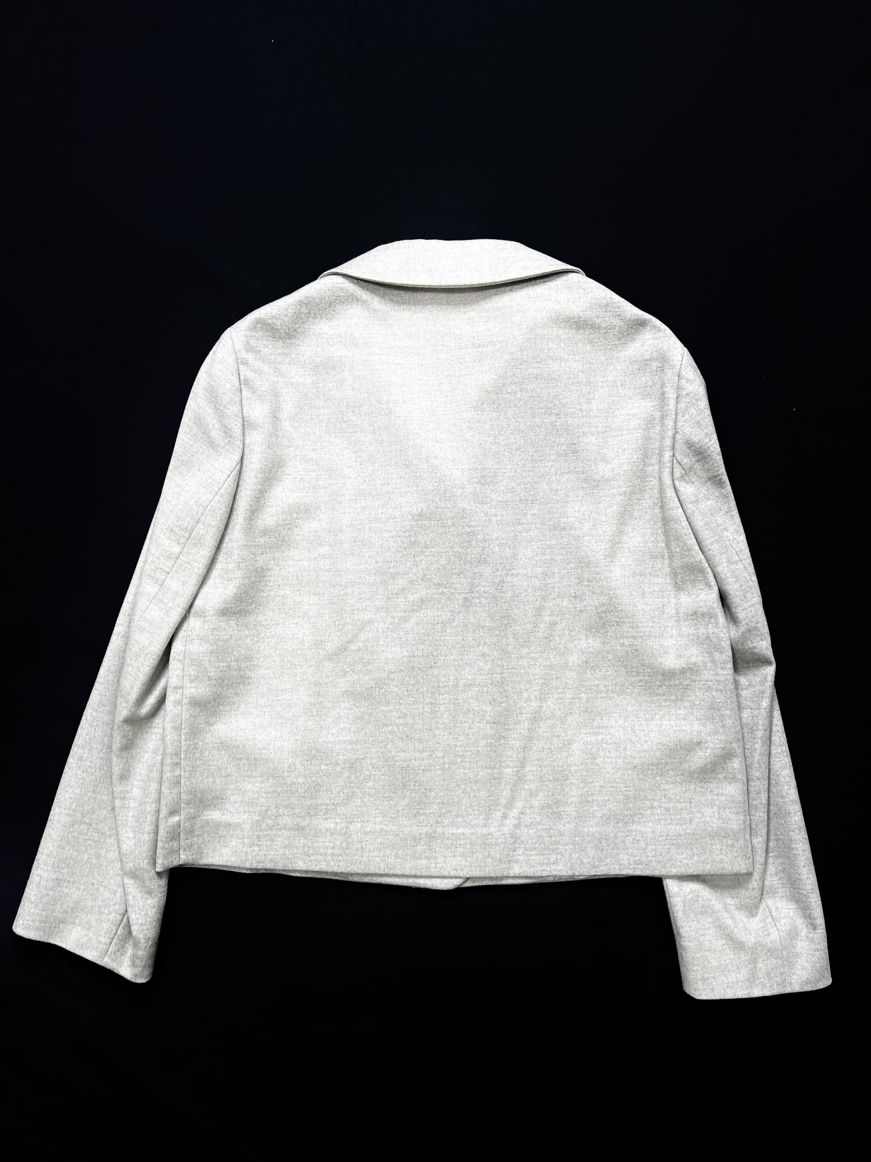 ショート丈のダブルブレステッド、比翼仕立て、ピュアなグレーを好むラフらしいミニマルな作りです。
