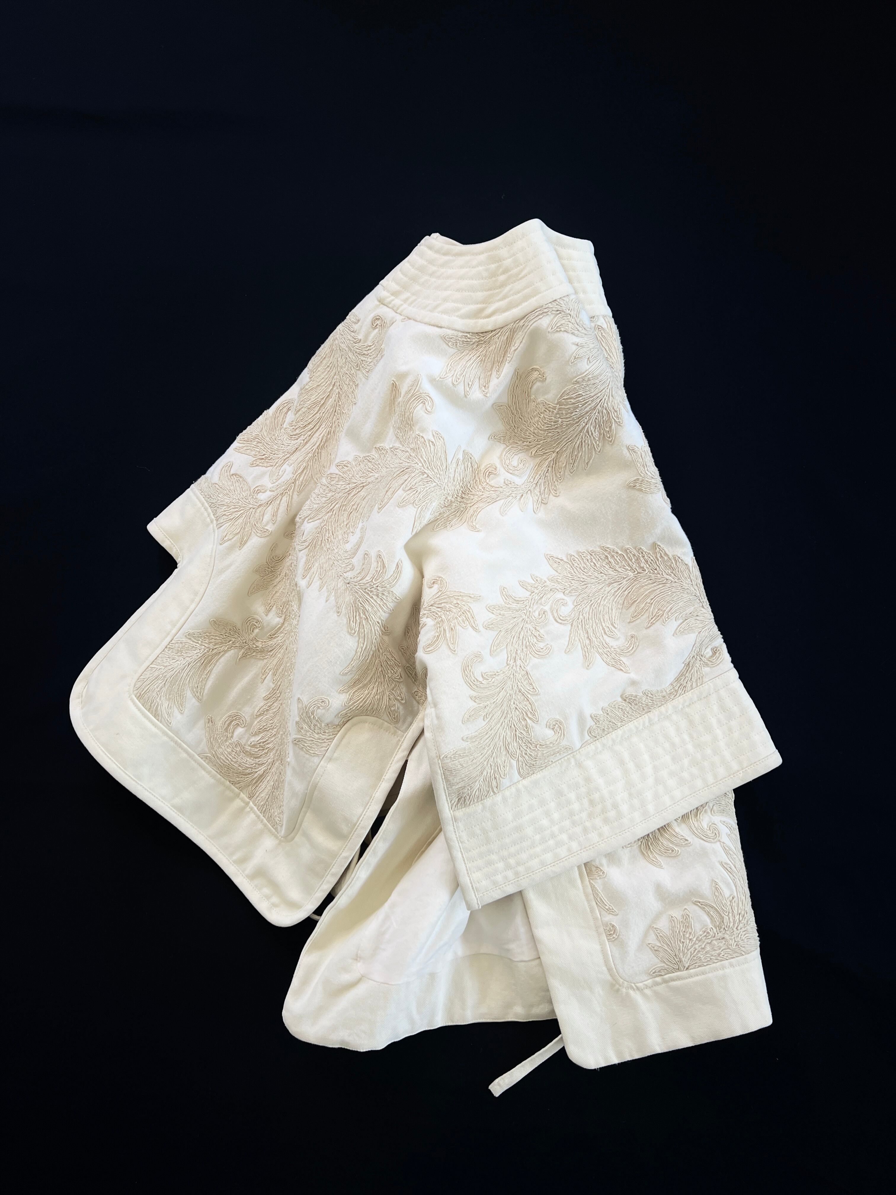 コットンのキャンバス生地に密度の高い刺繍が施されたショートコート