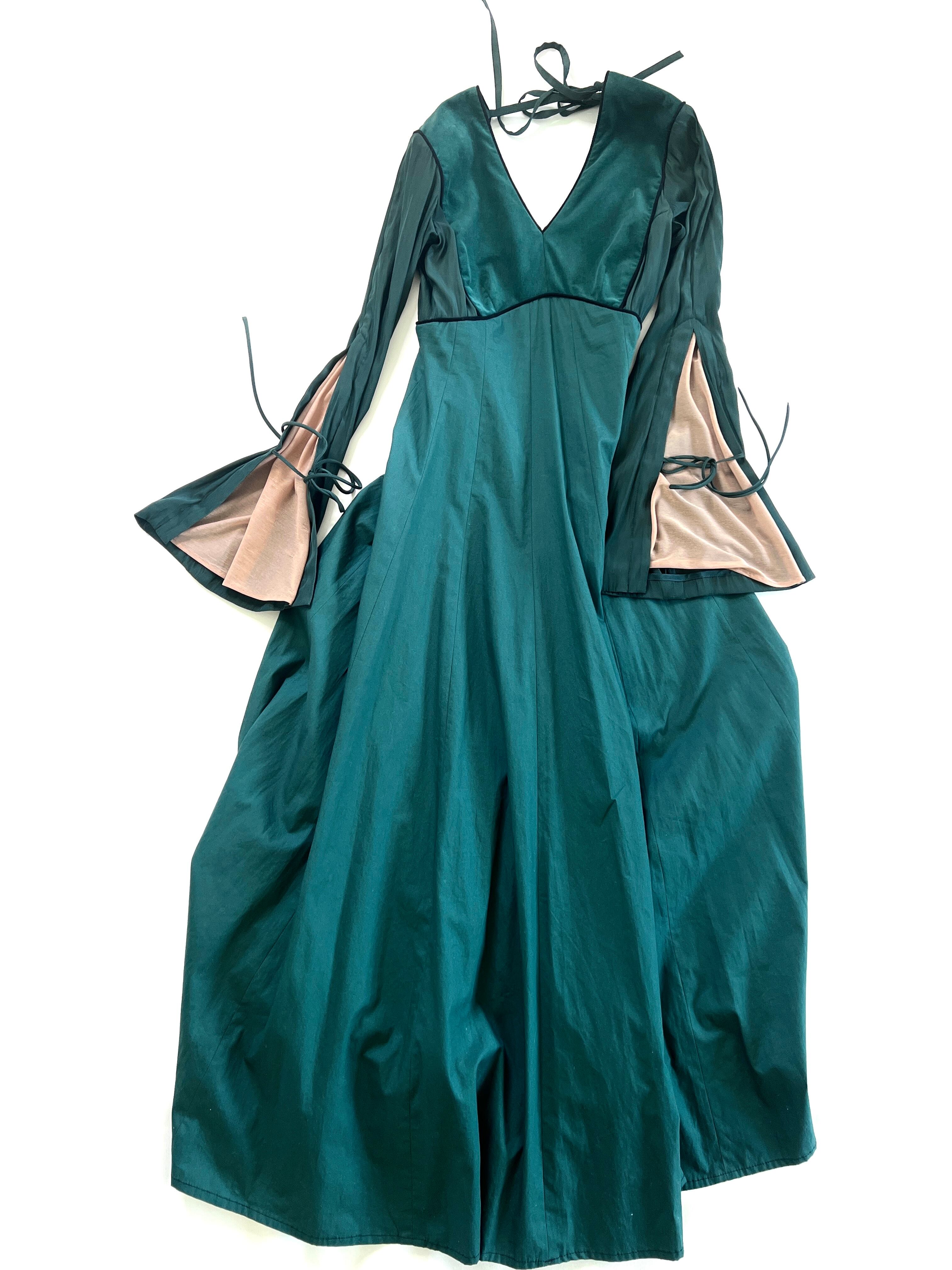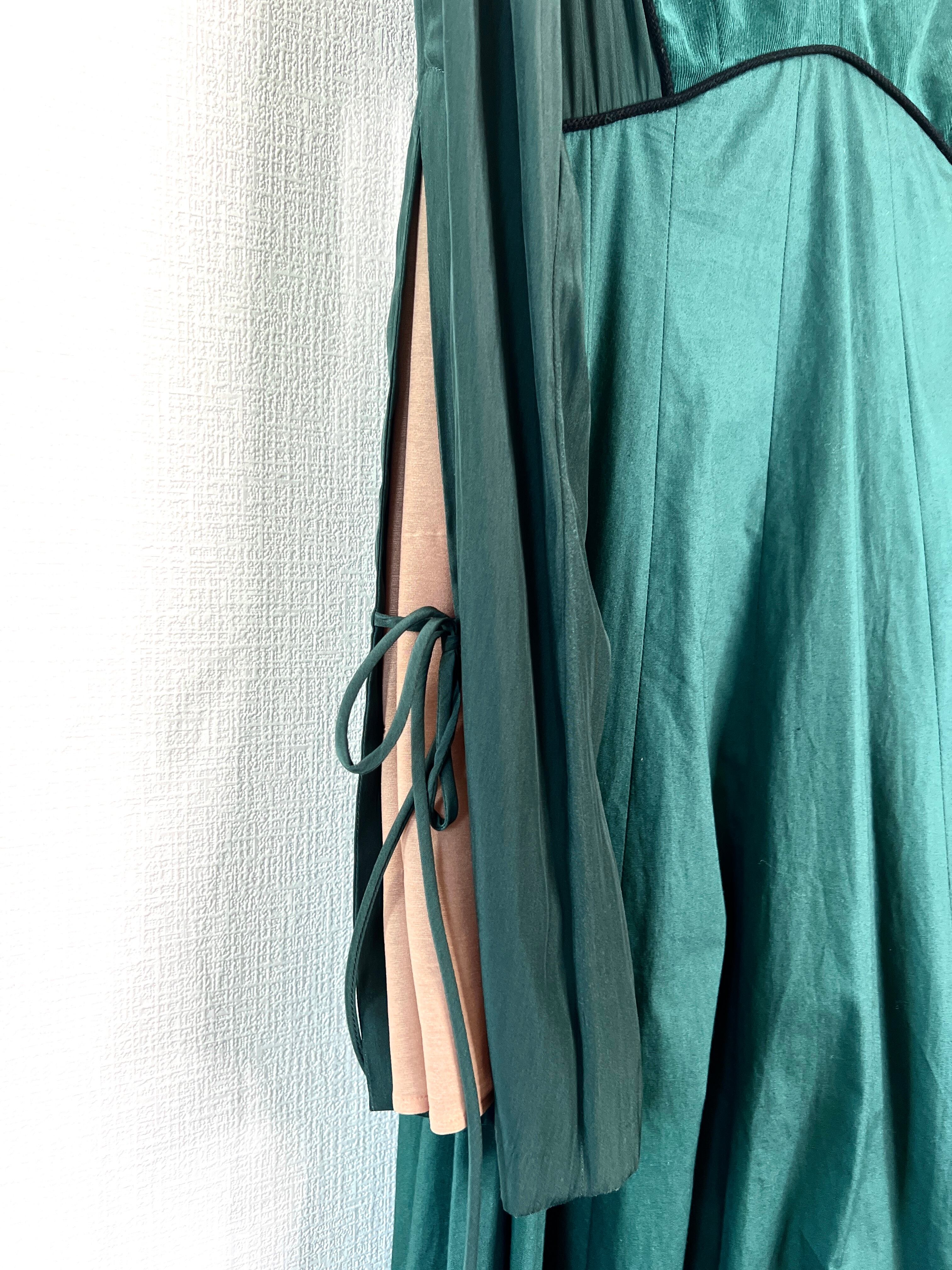 パイピングで区切られたグリーンの配色、カットされたベルスリーブから覗くシアー素材、長いリボン使いなど細部まで抜かりない手の込んだディテールワークです。