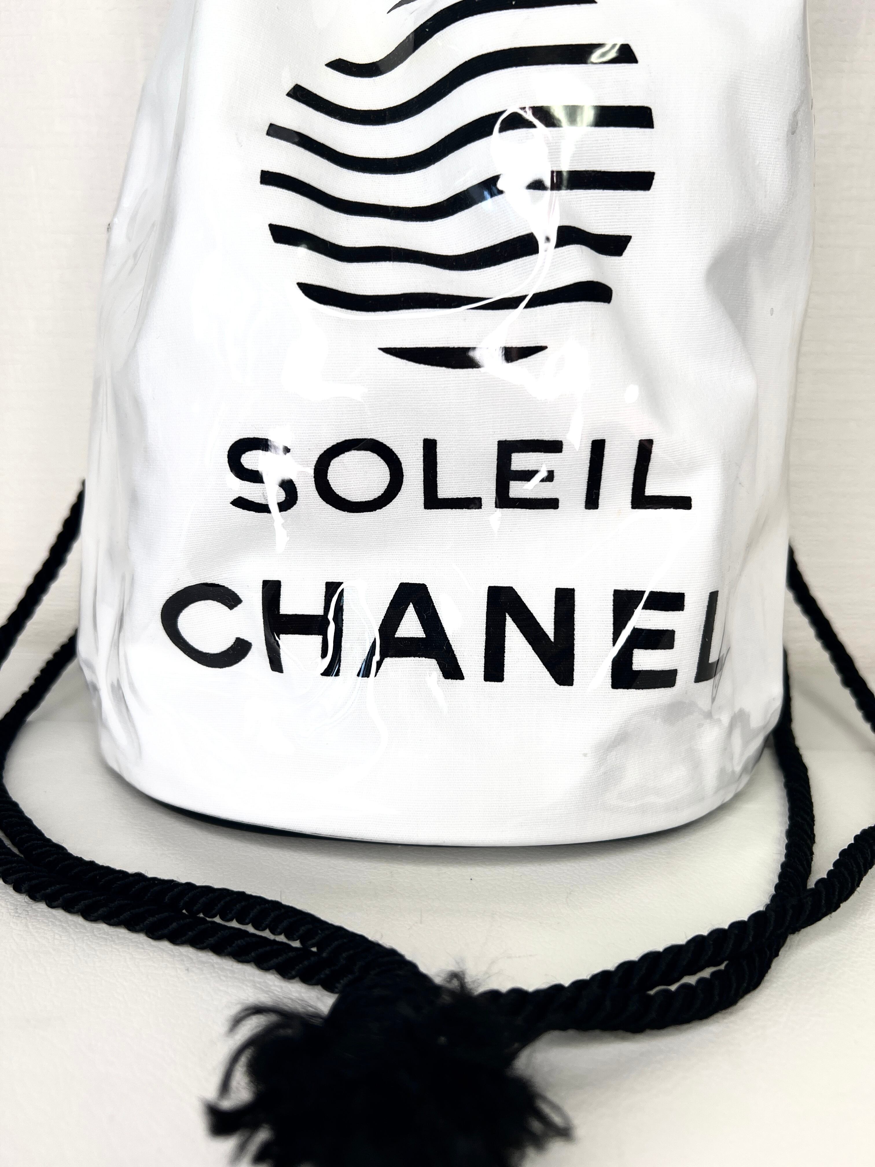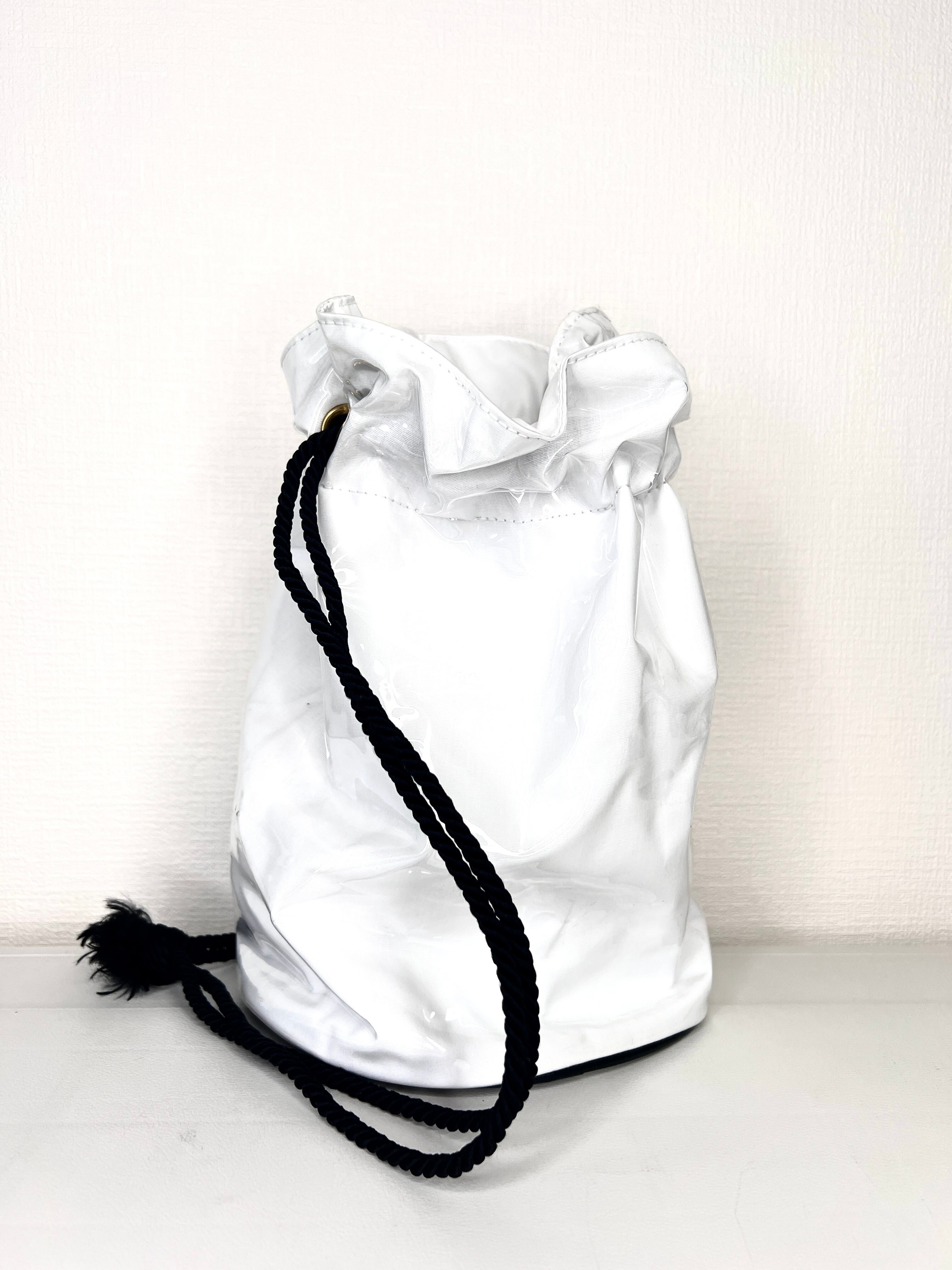 コットンキャンバスにビニールコーティングを施した白地にロゴプリントが映えるシンプルなアイテムです。裏地はエコレザー貼りとなっています。