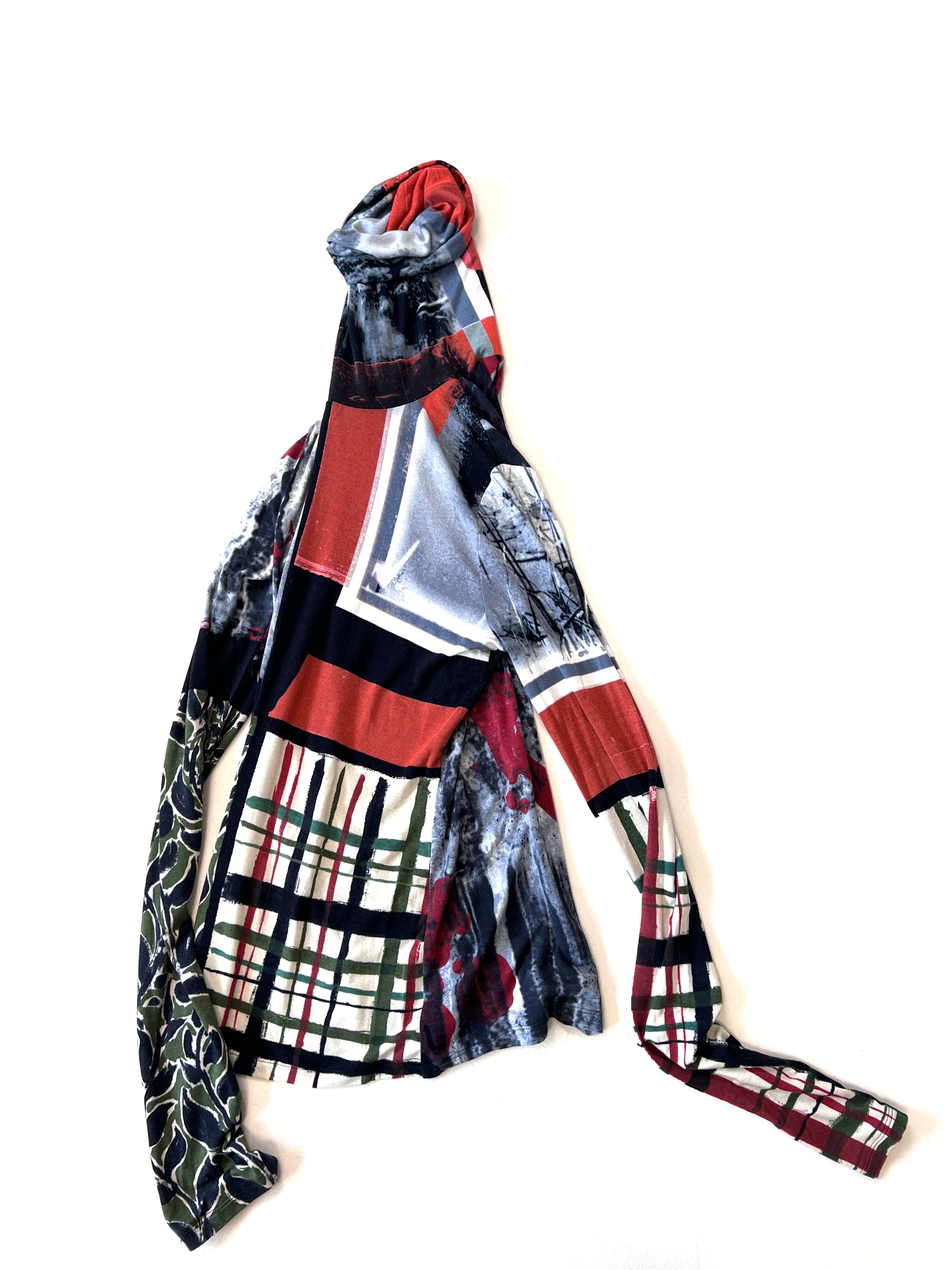 バイオフォトやフローラル、アートペインティングをパッチワーク風にプリントした1着。当時のゴルチエらしい独創的な世界観、1枚でもインナーにも映える逸品です。
