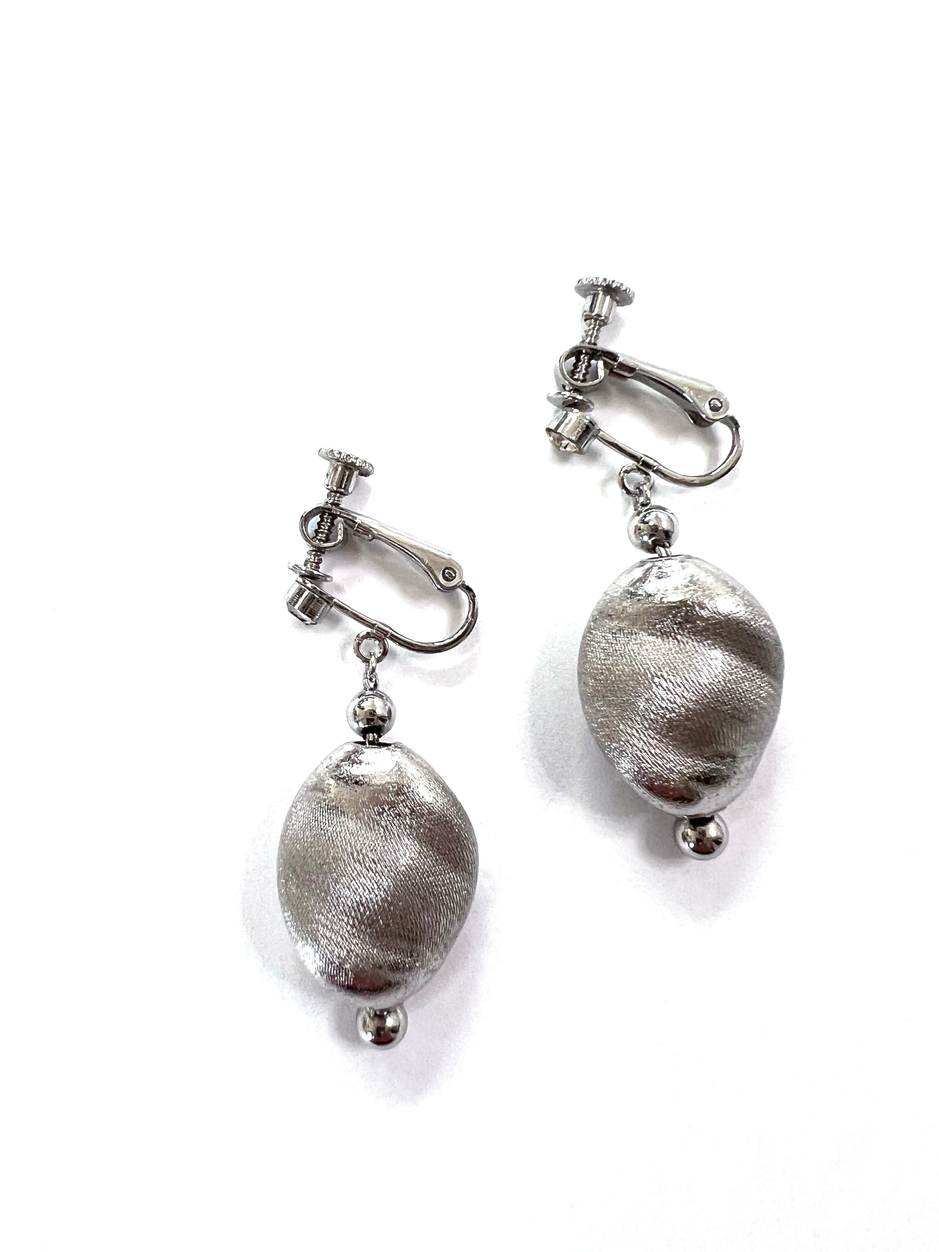 小さなそら豆のような形状のシルバーメタルのイヤリング。表面に微細なざらざらとした風合いを表現。単色のマットな光沢感が程良いアイテムです。
