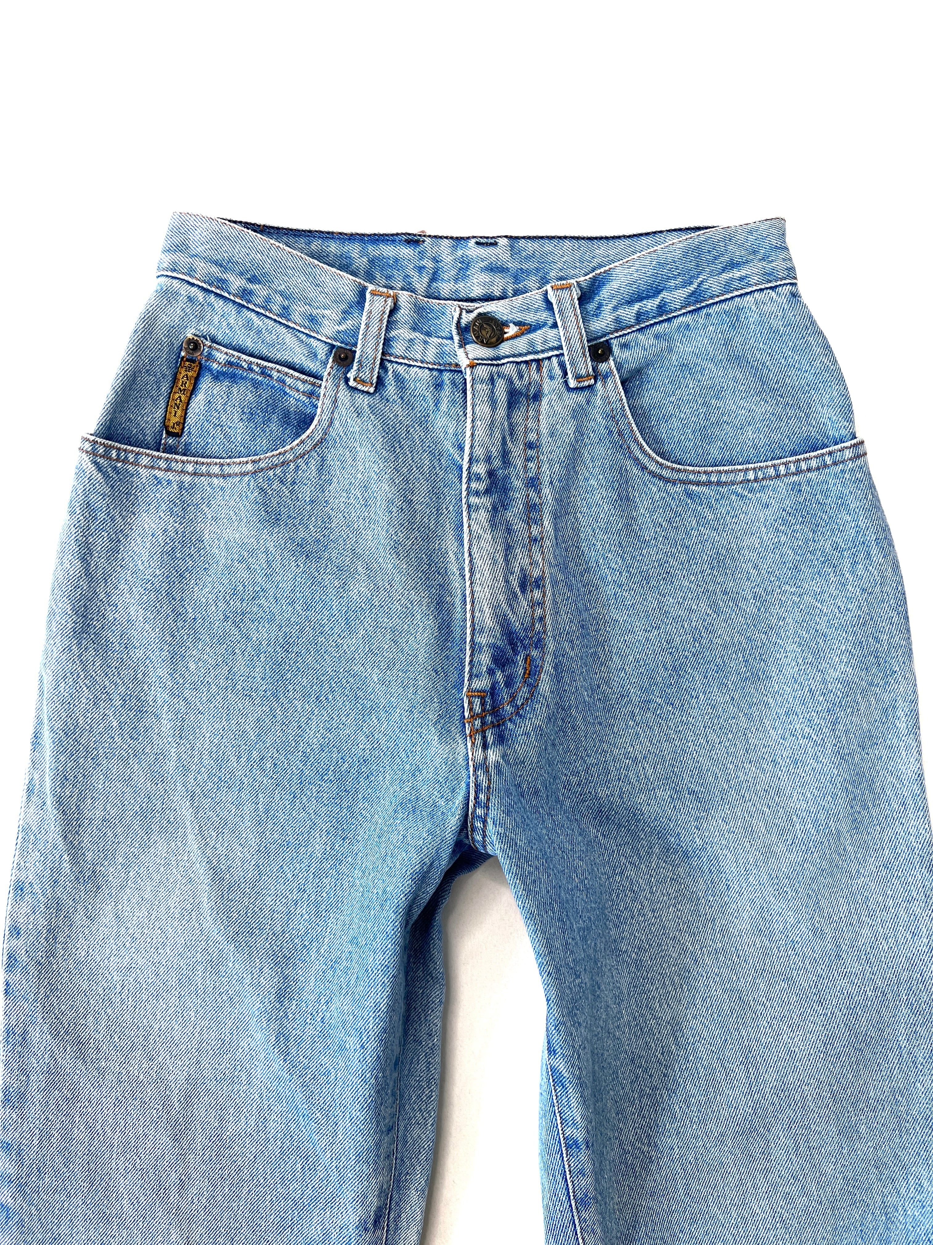 ハイウエストにフロントジップフライ、5ポケット、リベット、革パッチ、アイコンモチーフの金具と