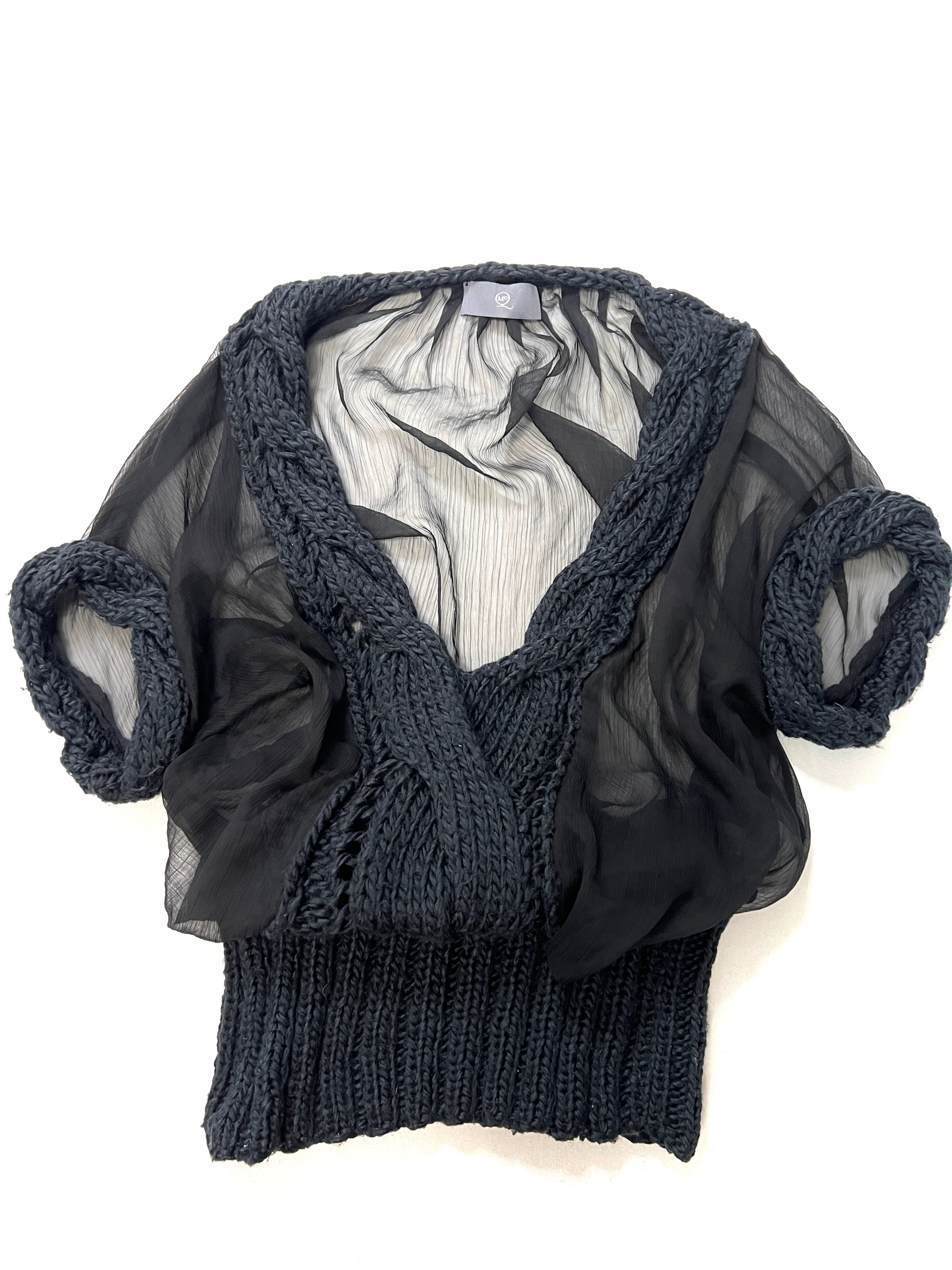 シフォン素材にケーブル編みのニットをドッキングさせたシアートップス。