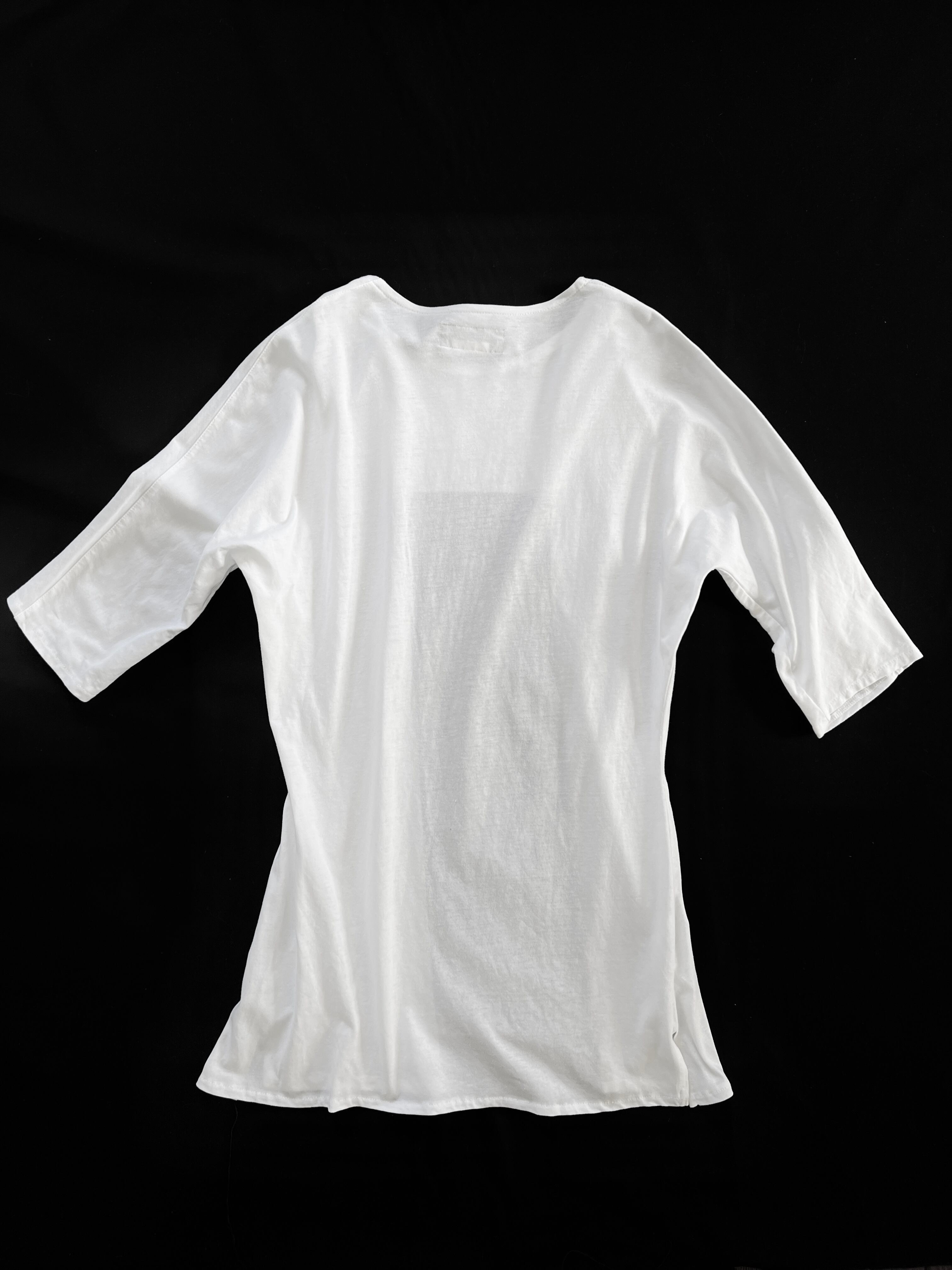 袖に切り替えのない一枚仕立てのような前後で布を重ねたような裁縫、フロントに黒のパネルを切り替えたアート作品のような逸品。