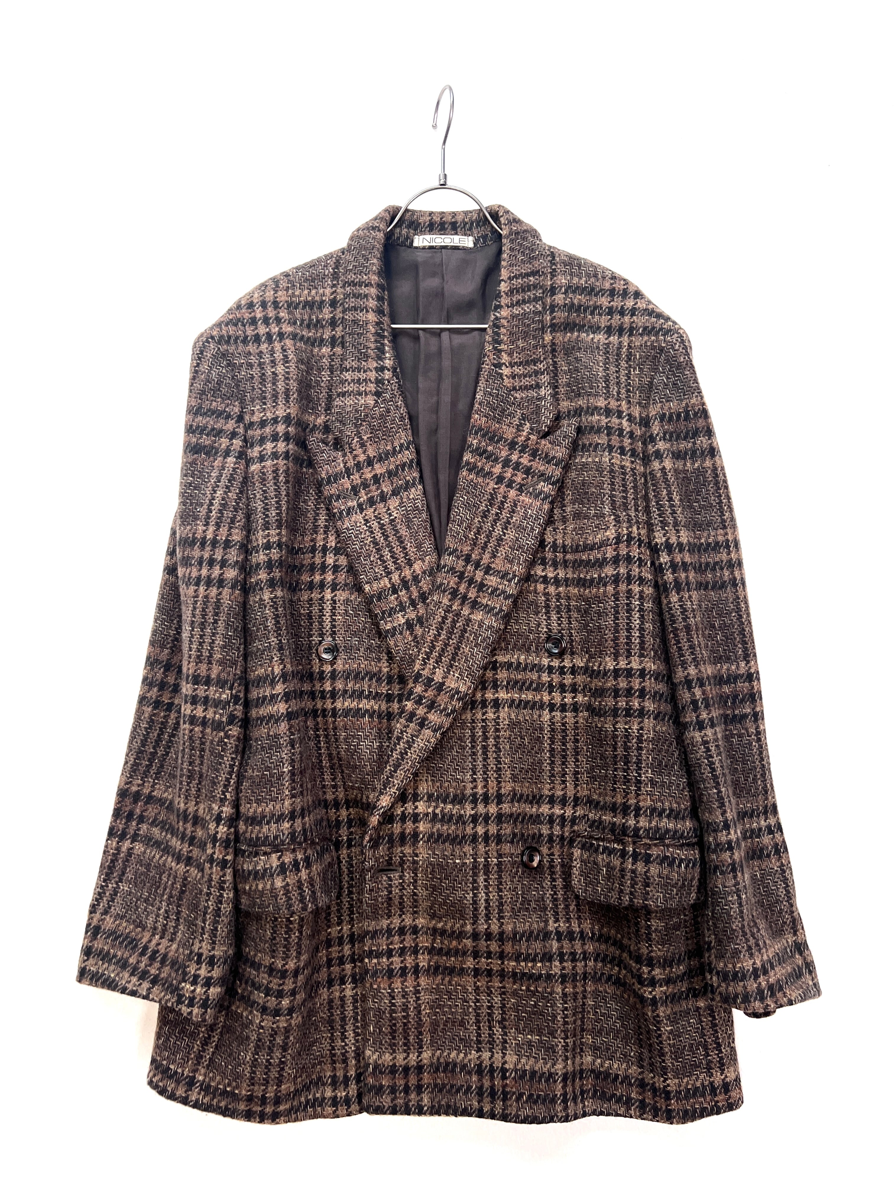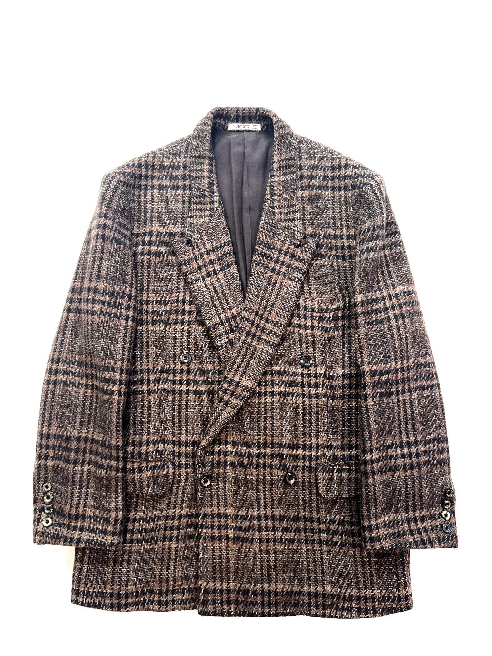 ニッティングウールによるピークドラペルのダブルブレストジャケット。クラシックなブラウン系のグレンチェック、80'sならでは、こだわりのテーラーリングによる確かな作りと着心地の良さを体感していただける逸品です。