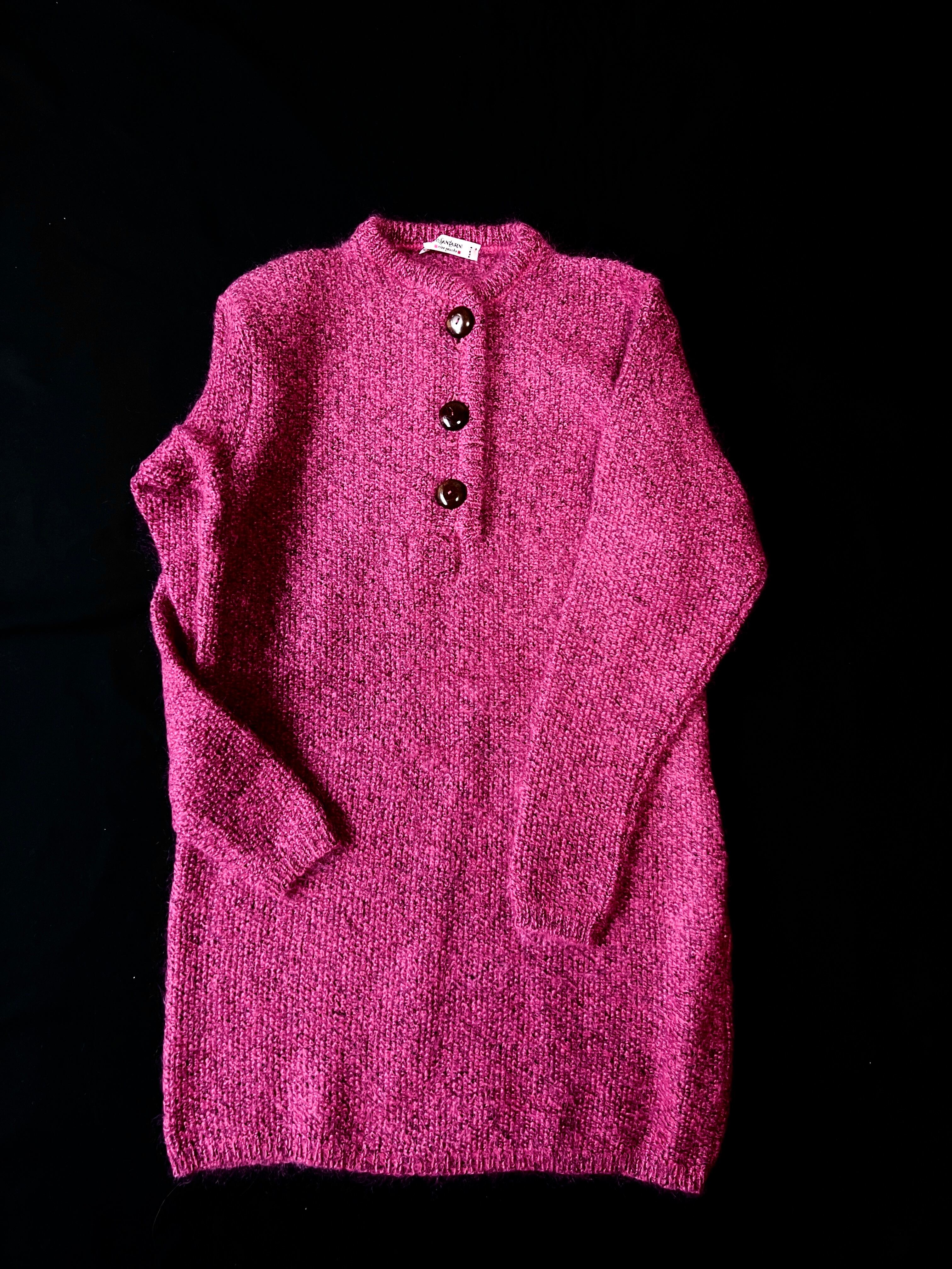 暖かく蒸れにくいアンゴラヤギの毛をブレンドしたモヘアニット。毛足が長く、やわらかい肌ざわりと美しい光沢。大きなボタンを配置したヘンリーネックはミリタリーニットから着想を得たかのようなデザインで丈は長めのシルエット。牡丹のようなピンクが可愛いサンローラン・リブゴーシュです!