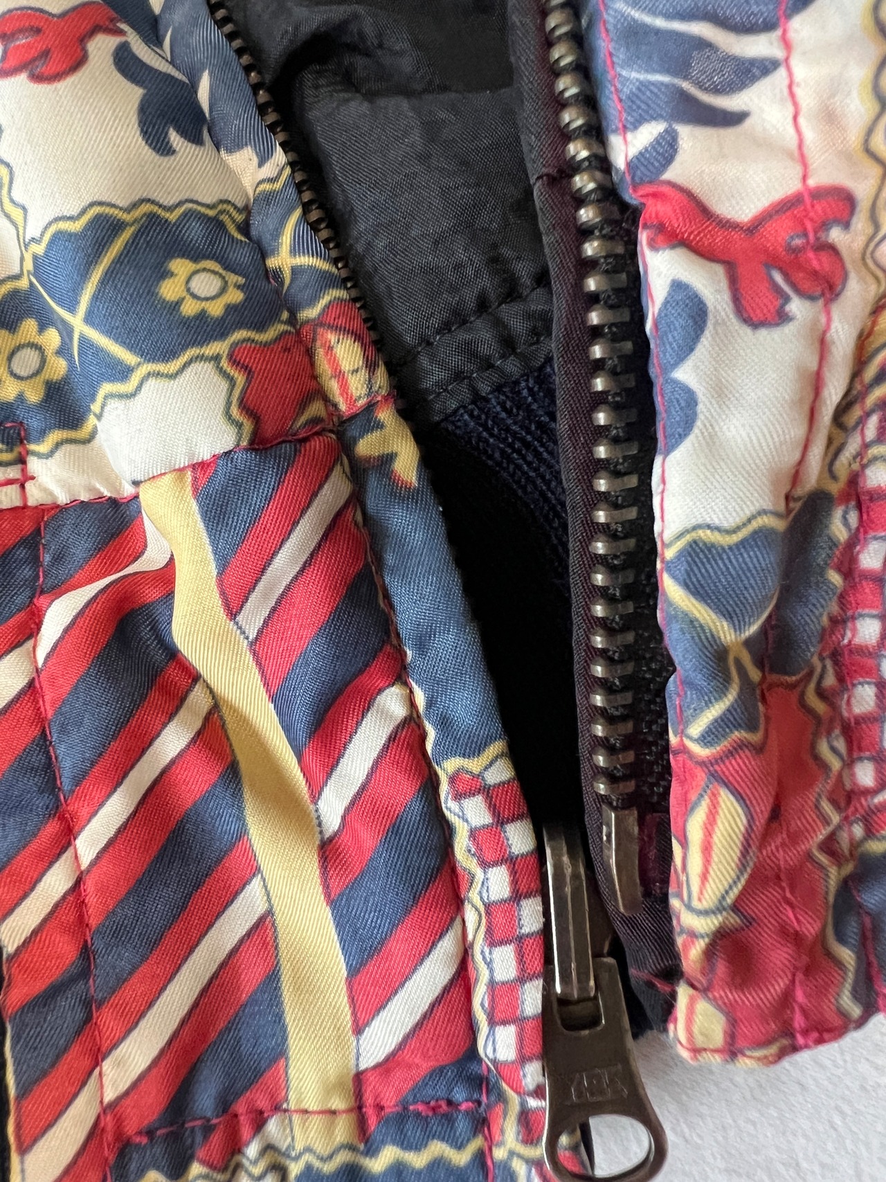 表面は銀糸のブランドロゴ刺繍 / 裏面はヨーロッパの紋章を敷き詰めたカラフルなファブリック。