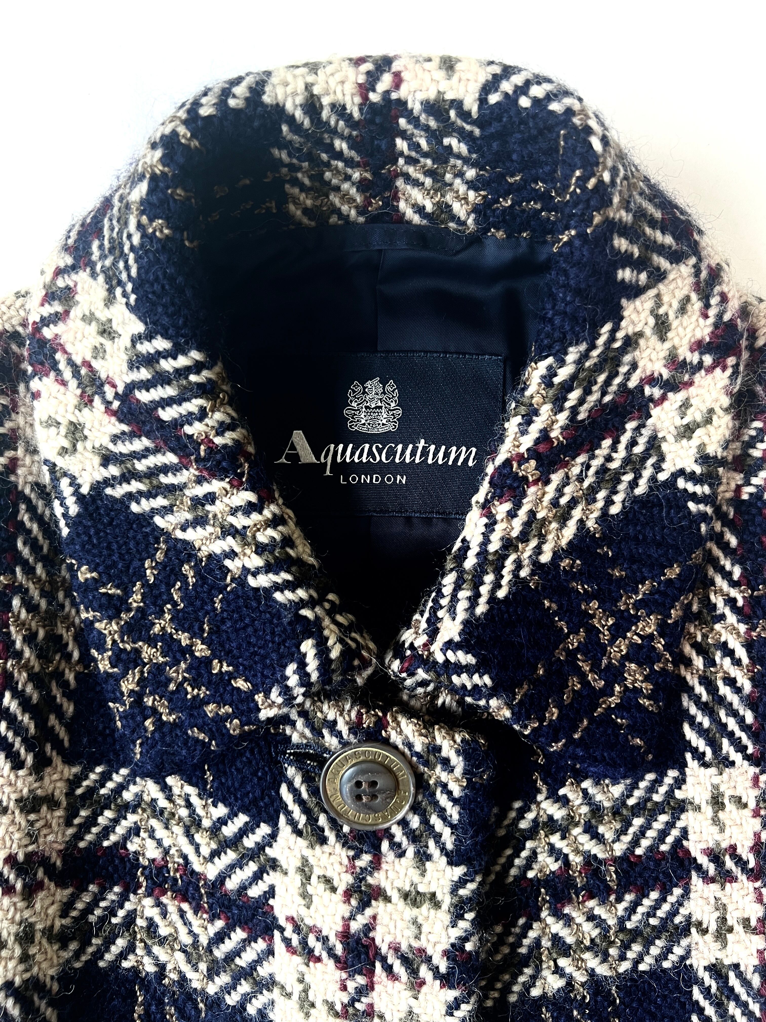英国らしい美しい配色のチェックにサークルロゴのアンティーク調ボタン、クラシックとエレガンスの凝縮されたアクアスキュータムならではの逸品です。