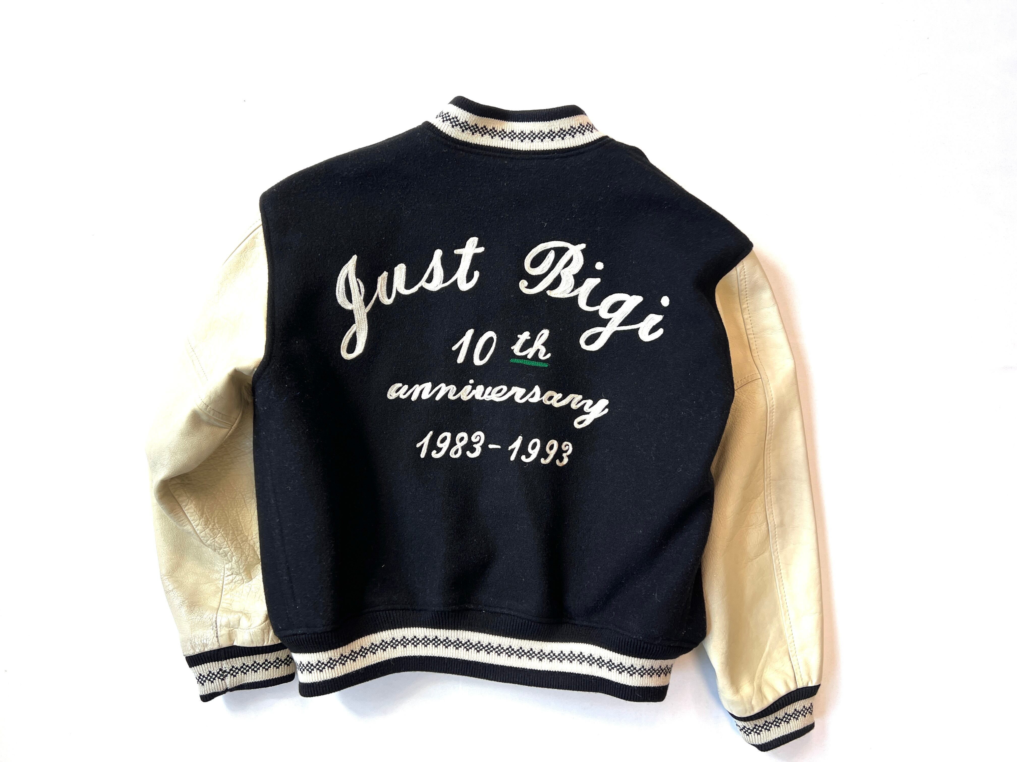 ジャスト・ビギ10周年を記念したスタジャンです。刺繍使いやリブ模様、イニシャルの〈J〉のワッペン、裏地の赤いチェックなどクラシックな雰囲気が演出されたヴィンテージの逸品です。